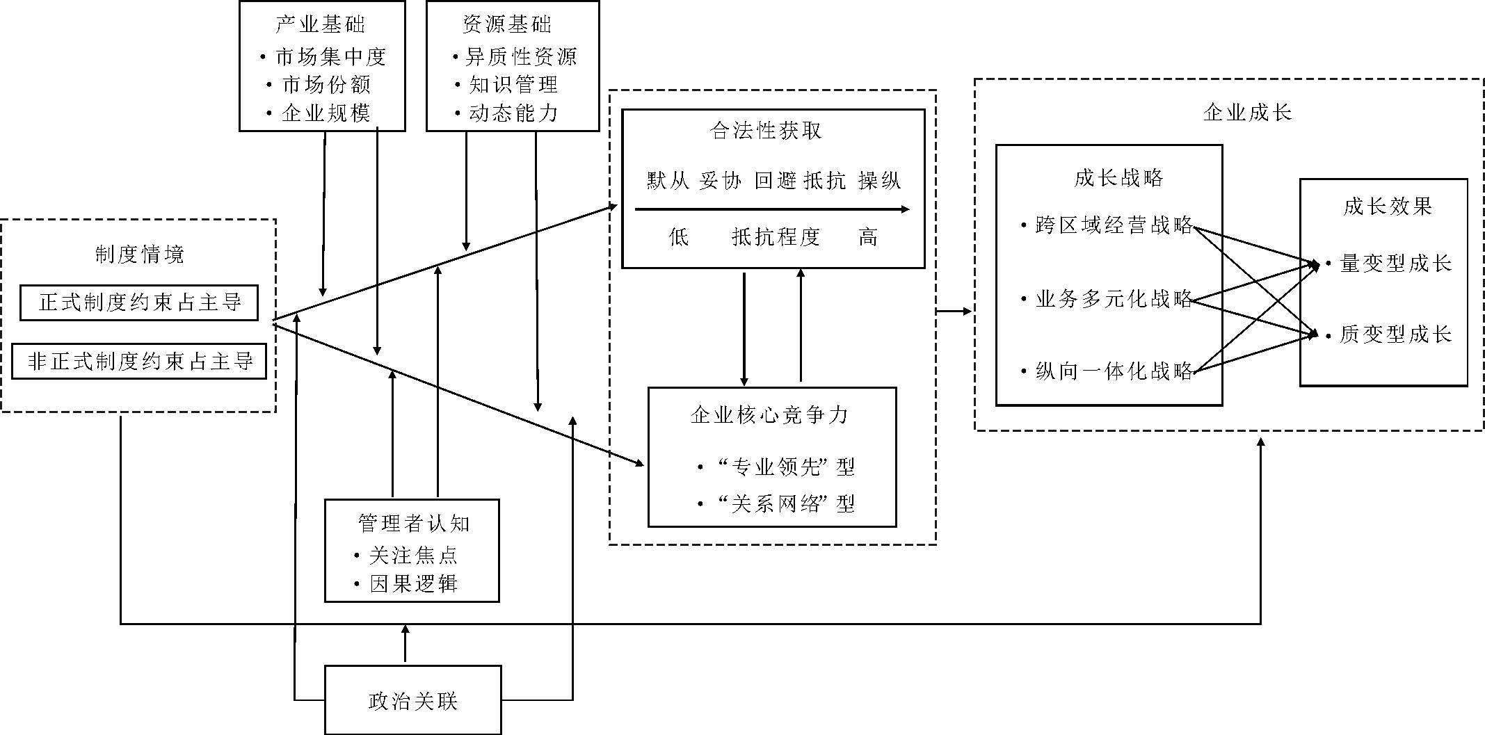 需重点指出的是,虽然美国等发达国家在该领域进行了大量研究,成为当前的核心研究群体,但相关研究大多基于一种成熟的制度环境。相对而言,美国等发达国家制度环境对企业成长的影响具有较高稳定性,而中国等转型经济体的制度环境是迅速变化的,制度要素多元化特性突显,制度主体与影响机制也更加复杂,这为制度视角的企业成长研究提供了先天优势。因此,国内学者在吸收学习国际重要研究成果的基础上,应立足于当前中国的转型背景,充分利用丰富的现实素材,推进制度视角的企业成长理论发展。