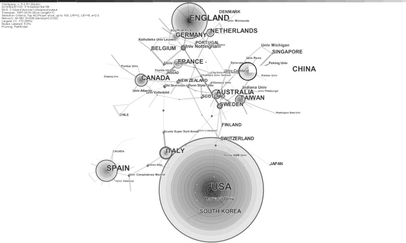 由图2可知,美国作为最大节点在混合网络图谱中脱颖而出。再结合表2中发文量来看,美国的领先优势十分突出,其文献贡献量达482篇,其次是英国(177篇)、西班牙(109篇)、中国(93篇)、加拿大(72篇)等。其中,美国作为该研究领域发文量最多的国家,主要以大学为研究主体,如哈佛大学(20篇)、密歇根大学(10篇)、印第安纳大学(9篇)以及宾夕法尼亚州立大学(7篇)等。从发文影响力来看,英国诺丁汉大学的中心度最大(0.49),说明该校与网络中大多数国家或研究机构存在密切合作。其次是意大利(0.45)、瑞典(0.43)、澳大利亚(0.36)、西班牙马德里康普顿斯大学(0.35)、美国(0.34)、比利时根特大学(0.34)、西班牙(0.33)、加拿大(0.24)、英国(0.23)等。结合图3可知,美国、英国、西班牙、加拿大、意大利、澳大利亚以及瑞典7国外环颜色较深,并且各节点由关键路径相连,说明“美国—英国—西班牙—加拿大—意大利—澳大利亚—瑞典”是该领域核心研究群体。