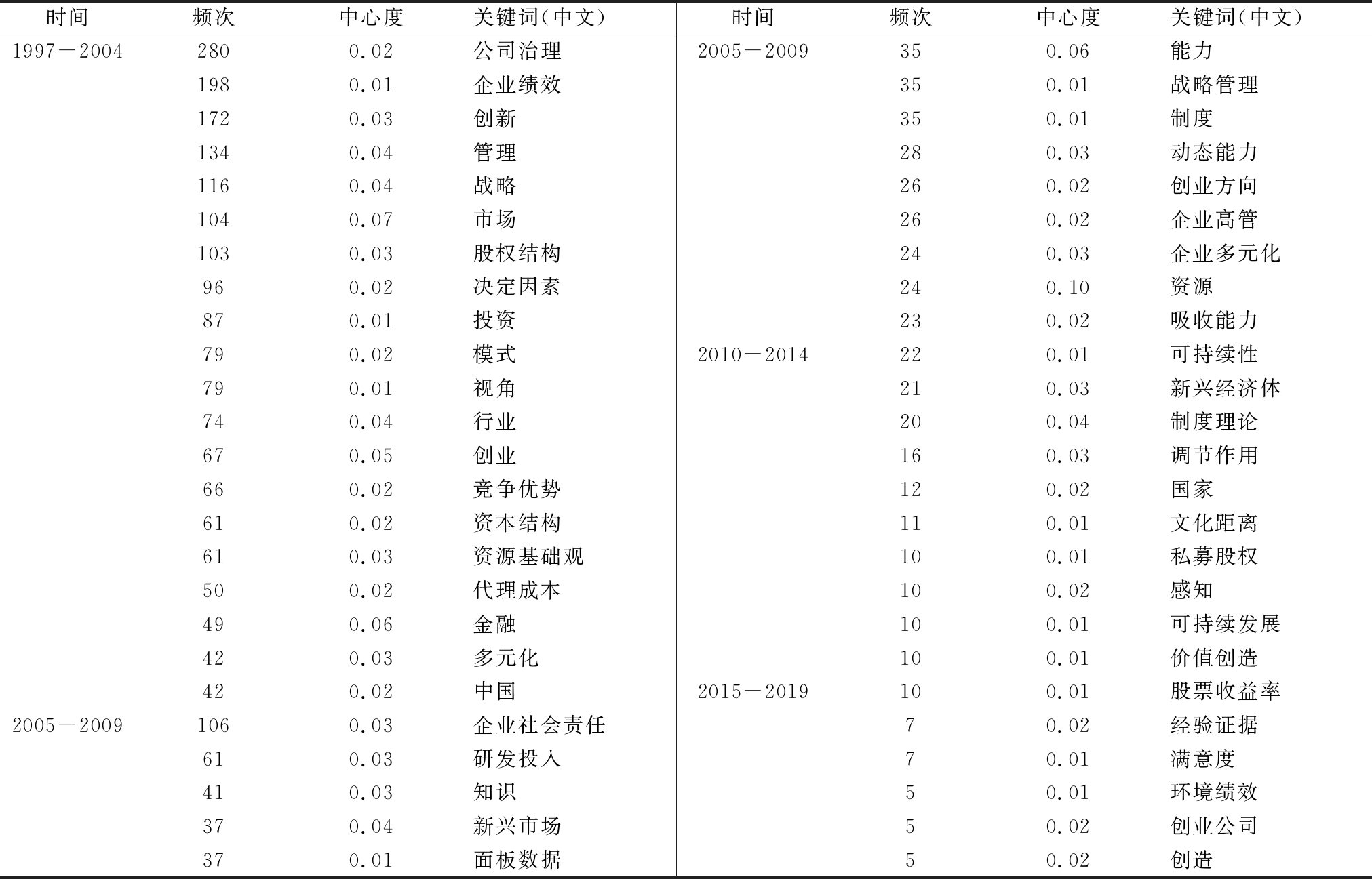 注:本文为准确划分各阶段研究热点,选择性剔除各阶段少量、低频次非主要关键词,具体操作为:1997-2004年提取频次≥40的节点,2005-2009年提取频次≥20的节点,2010-2014年提取频次≥10的节点,2015-2019年提取频次≥5的节点