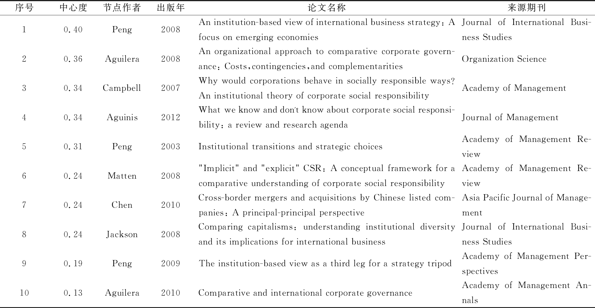 序号中心度节点作者出版年论文名称来源期刊10.40Peng2008An institution-based view of international business strategy: A focus on emerging economiesJournal of International Busi-ness Studies20.36Aguilera2008An organizational approach to comparative corporate govern-ance: Costs,contingencies,and complementaritiesOrganization Science30.34Campbell2007Why would corporations behave in socially responsible ways? An institutional theory of corporate social responsibilityAcademy of Management40.34Aguinis2012What we know and don't know about corporate social responsi-bility: a review and research agendaJournal of Management50.31Peng2003Institutional transitions and strategic choicesAcademy of Management Re-view60.24Matten2008"Implicit" and "explicit" CSR: A conceptual framework for a comparative understanding of corporate social responsibilityAcademy of Management Re-view70.24Chen2010Cross-border mergers and acquisitions by Chinese listed com-panies: A principal-principal perspectiveAsia Pacific Journal of Manage-ment80.24Jackson2008Comparing capitalisms: understanding institutional diversity and its implications for international businessJournal of International Busi-ness Studies90.19Peng2009The institution-based view as a third leg for a strategy tripodAcademy of Management Per-spectives100.13Aguilera2010Comparative and international corporate governanceAcademy of Management An-nals
