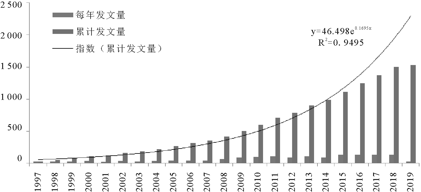为了从整体上探明制度情境差异对企业成长影响的相关文献数量变化及其时序演变规律,本文对检索收集到的1 529篇文献进行年度分布统计,如图1所示。整体上看,该领域年度发文量呈线性增长趋势,除2007-2008年发文量增长较快外,其余各年度增速均较慢。因此,以2007年为转折点可将该领域研究分为2个阶段:1997-2007年发文量较少且增幅较小,年均发文量仅有32篇,表明该领域研究处于不温不火的酝酿时期;2008-2019年发文量明显提升,年均发文量达到105篇,表明该领域研究逐渐成为国内外学者关注的研究热点。通过拟合累计发文量变化趋势:y=46.498e0.1695x,R2=0.949 5,发现该领域累计文献数呈指数增长,并且从2017年起,累计发文量理论值与实际值的差值逐年增加,反映该领域研究自2017年起趋向成熟。
