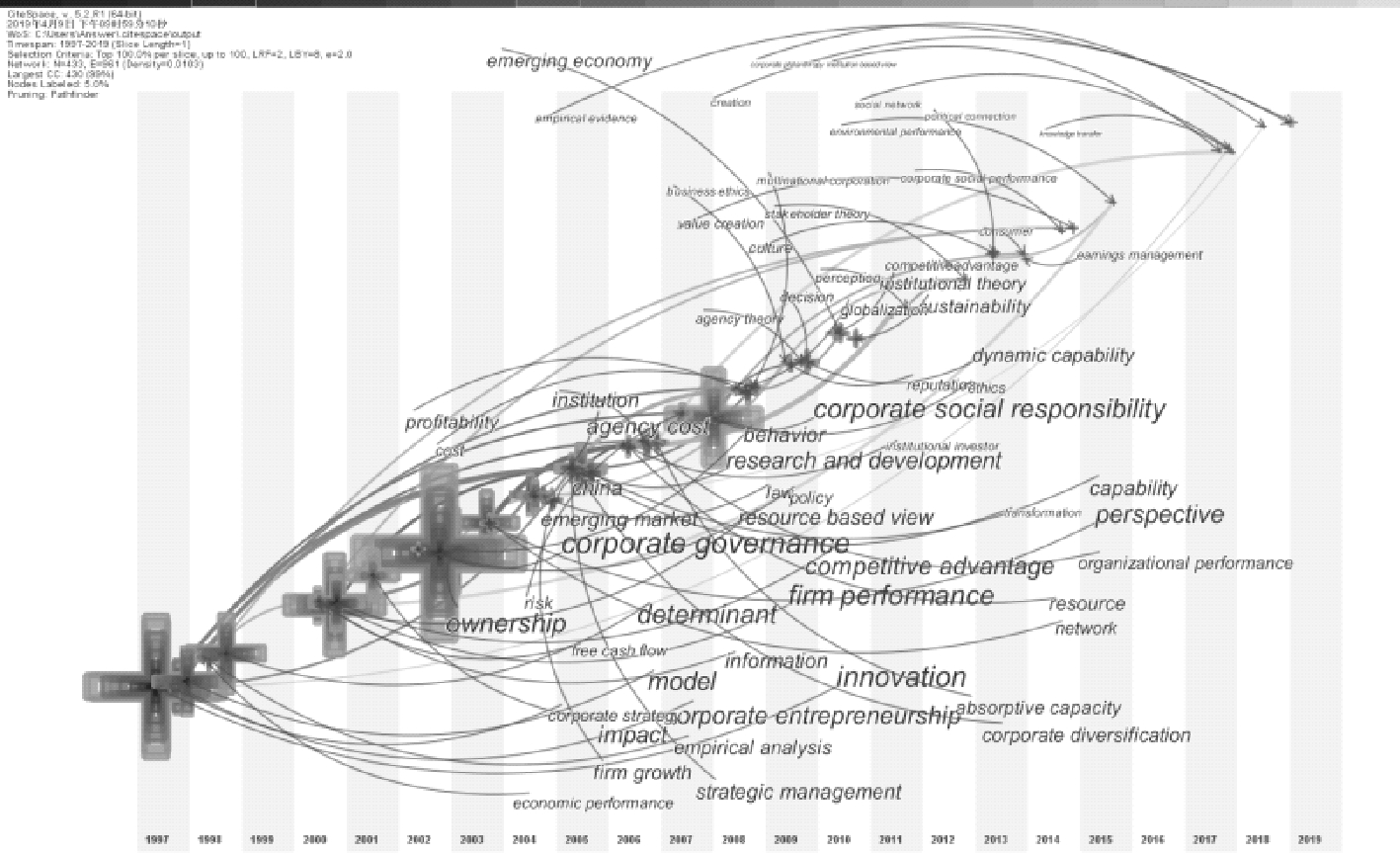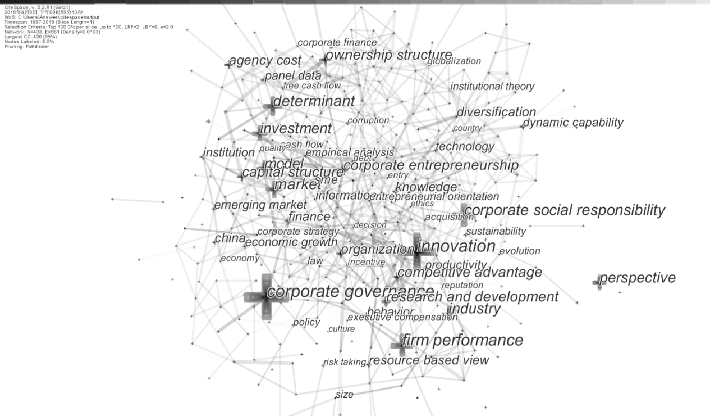 在某一时期内,数量较多且具有内在关联的一组文献所关注的视角或主题称为研究热点。分析制度情境对企业成长的影响研究领域热点演进,有助于厘清该领域在各时期的关注焦点。文献题录所涵盖的关键词,分为作者关键词与增补关键词(Web of Science 的 DE和 ID 两个知识单元),可集中描述并高度概括文献的核心内容,因此,运用关键词共现分析方法(不同关键词在同一篇文献中出现称为关键词共现),确定制度情境对企业成长的影响研究热点。运行Citespace V,节点类型选择“Keyword”,设置阈值为“Top 30% per slice (up to 100)”,绘制关键词共现网络图谱,如图3所示。