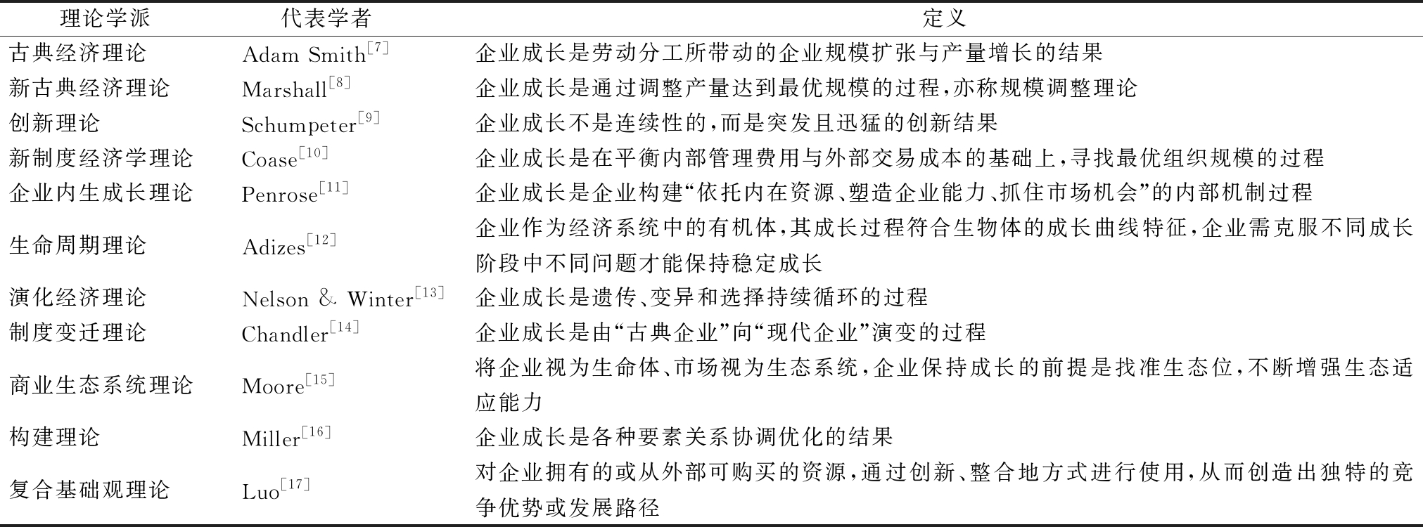 企业成长作为驱动整体经济与全行业持续发展的关键因素,受到政策制定者、实践者以及相关研究人员的高度关注,是管理学研究领域的核心问题之一。亚当·斯密[7]最先将企业成长问题引入学术研究范畴,用企业分工的规模效应解释企业成长,他指出企业作为一种社会组织,其存在的目的是获取规模经济所带来的利益,而规模经济就产生于企业分工后的低成本、高产值生产过程中,因此,企业成长与行业分工协作高度正相关。此后,学者们纷纷尝试从不同理论视角解读企业成长,并给出了不同定义,具体内容如表1所示。