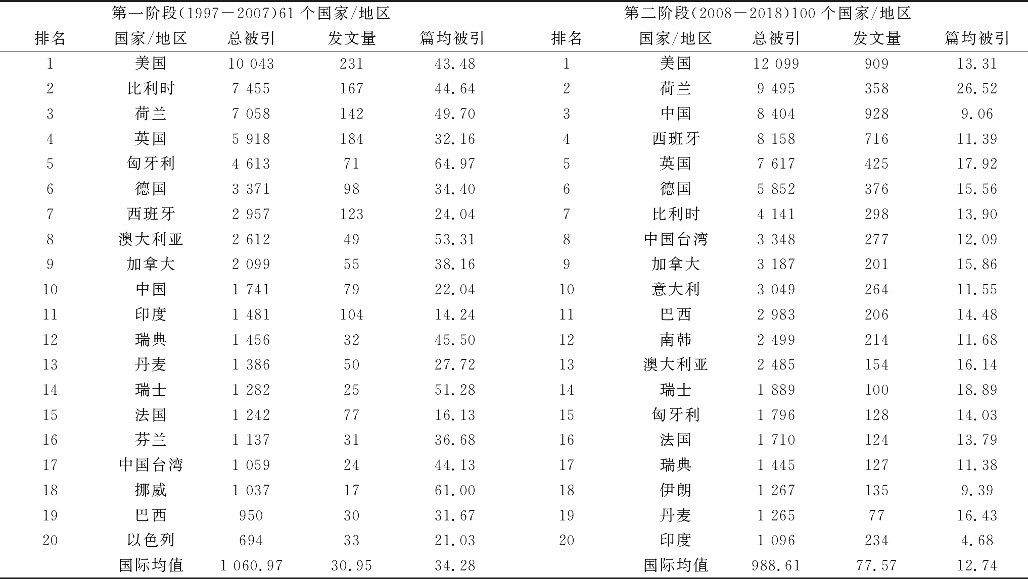 第一阶段(1997-2007)61个国家/地区排名国家/地区总被引发文量篇均被引第二阶段(2008-2018)100个国家/地区排名国家/地区总被引发文量篇均被引1美国10 04323143.48 1美国12 09990913.31 2比利时7 45516744.64 2荷兰9 49535826.52 3荷兰7 05814249.70 3中国8 4049289.06 4英国5 91818432.16 4西班牙8 15871611.39 5匈牙利4 6137164.97 5英国7 61742517.92 6德国3 3719834.40 6德国5 85237615.56 7西班牙2 95712324.04 7比利时4 14129813.90 8澳大利亚2 6124953.31 8中国台湾3 34827712.09 9加拿大2 0995538.16 9加拿大3 18720115.86 10中国1 7417922.04 10意大利3 04926411.55 11印度1 48110414.24 11巴西2 98320614.48 12瑞典1 4563245.50 12南韩2 49921411.68 13丹麦1 3865027.72 13澳大利亚2 48515416.14 14瑞士1 2822551.28 14瑞士1 88910018.89 15法国1 2427716.13 15匈牙利1 79612814.03 16芬兰1 1373136.68 16法国1 71012413.79 17中国台湾1 0592444.13 17瑞典1 44512711.38 18挪威1 0371761.00 18伊朗1 2671359.39 19巴西9503031.67 19丹麦1 2657716.43 20以色列6943321.03 20印度1 0962344.68 国际均值1 060.9730.9534.28 国际均值988.6177.5712.74