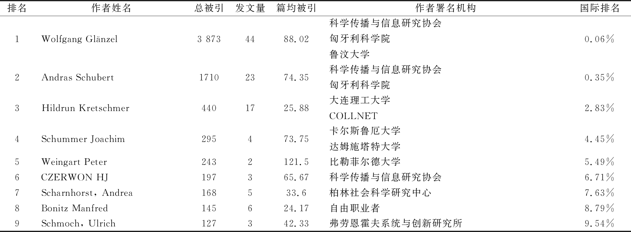 排名作者姓名总被引发文量篇均被引作者署名机构国际排名1Wolfgang Glänzel3 8734488.02科学传播与信息研究协会匈牙利科学院鲁汶大学0.06%2Andras Schubert17102374.35科学传播与信息研究协会匈牙利科学院0.35%3Hildrun Kretschmer4401725.88大连理工大学 COLLNET2.83%4Schummer Joachim295473.75卡尔斯鲁厄大学达姆施塔特大学4.45%5Weingart Peter2432121.5比勒菲尔德大学5.49%6CZERWON HJ197365.67科学传播与信息研究协会6.71%7Scharnhorst, Andrea168533.6柏林社会科学研究中心7.63%8Bonitz Manfred145624.17自由职业者8.79%9Schmoch, Ulrich127342.33弗劳恩霍夫系统与创新研究所9.54%