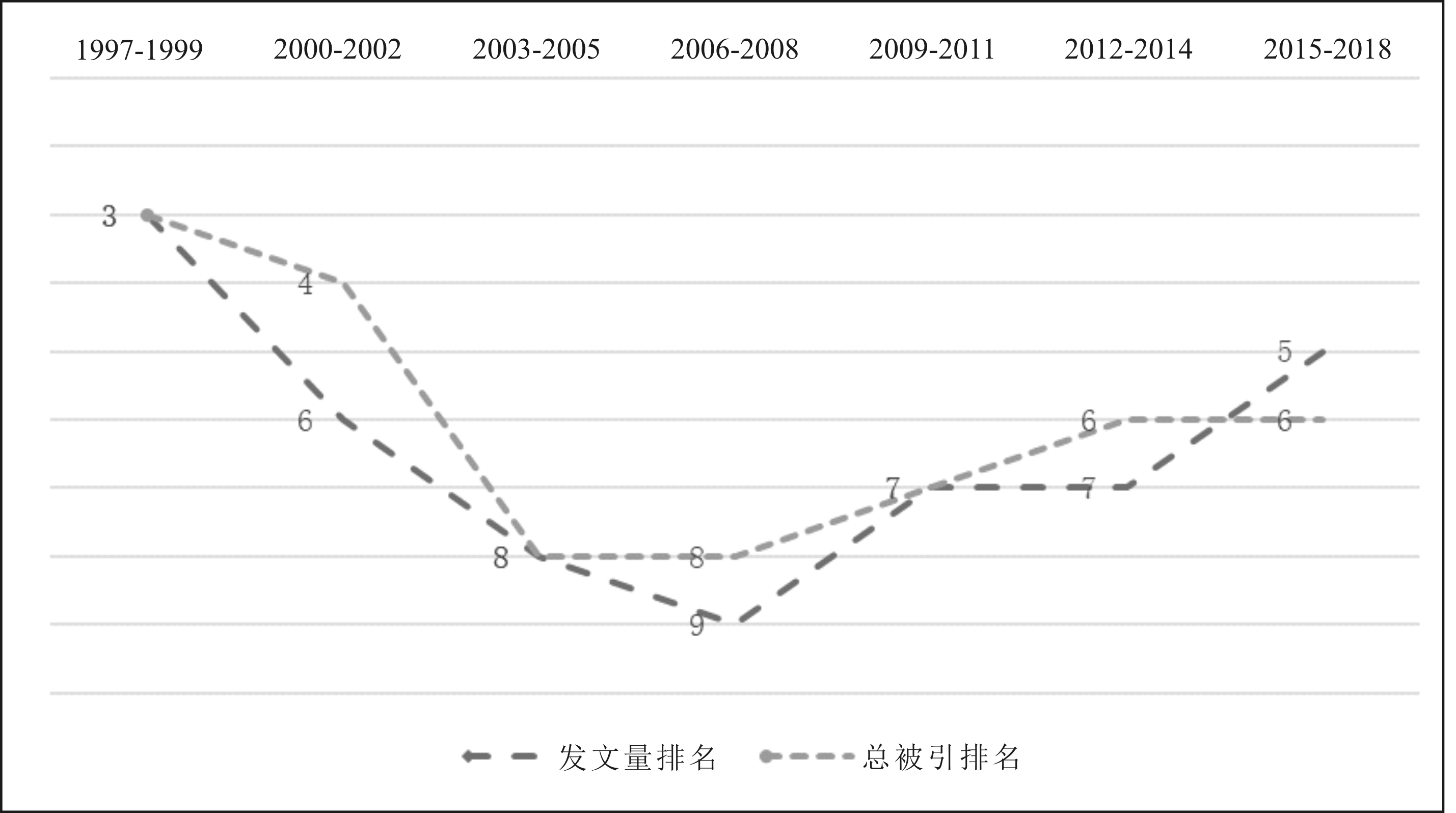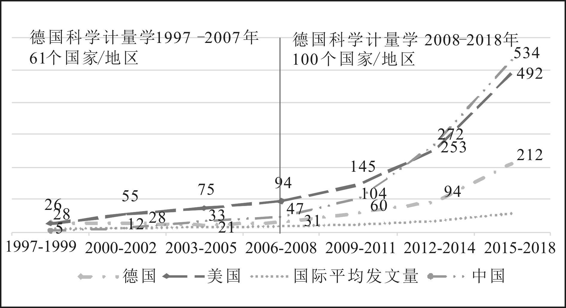 本文将1997-2018年德国科学计量学发展分为两个阶段,从国家、机构、研究者3个层面对发文量和总被引频次进行分析、比较。在22年的发展历程中,德国科学计量学在世界舞台上的影响力经历了由盛转衰再复兴的过程。中国的情况与之相反,1997—1999年发文5篇,2015—2018发文534篇,在科学计量学领域经历了高速发展过程,在国际舞台上迅速崛起,从低于国际均值到成为世界发文第一大国。