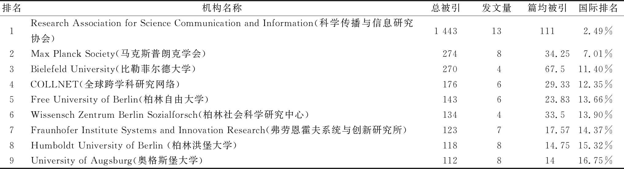 排名机构名称总被引发文量篇均被引国际排名1Research Association for Science Communication and Information(科学传播与信息研究协会)1 443131112.49%2Max Planck Society(马克斯普朗克学会)274834.257.01%3Bielefeld University(比勒菲尔德大学)270467.511.40%4COLLNET(全球跨学科研究网络)176629.3312.35%5Free University of Berlin(柏林自由大学)143623.8313.66%6Wissensch Zentrum Berlin Sozialforsch(柏林社会科学研究中心)134433.513.90%7Fraunhofer Institute Systems and Innovation Research(弗劳恩霍夫系统与创新研究所)123717.5714.37%8Humboldt University of Berlin (柏林洪堡大学)118814.7515.32%9University of Augsburg(奥格斯堡大学)11281416.75%