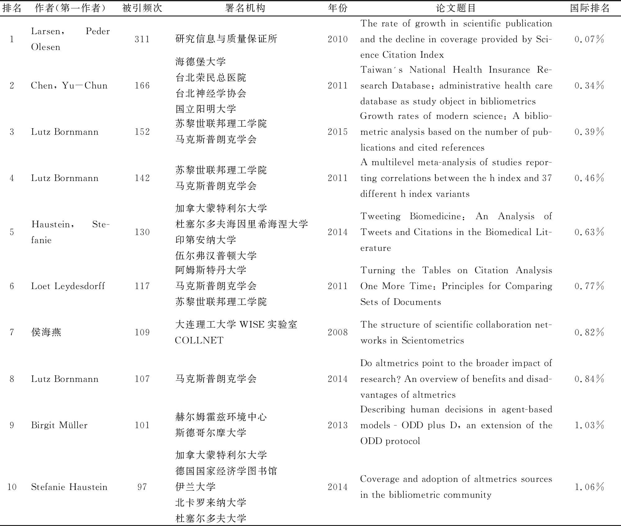 排名作者(第一作者)被引频次署名机构年份论文题目国际排名1Larsen, Peder Olesen311研究信息与质量保证所 2010The rate of growth in scientific publication and the decline in coverage provided by Sci-ence Citation Index0.07%2Chen, Yu-Chun166海德堡大学台北荣民总医院台北神经学协会国立阳明大学2011Taiwan's National Health Insurance Re-search Database: administrative health care database as study object in bibliometrics0.34%3Lutz Bornmann152苏黎世联邦理工学院马克斯普朗克学会 2015Growth rates of modern science: A biblio-metric analysis based on the number of pub-lications and cited references0.39%4Lutz Bornmann142苏黎世联邦理工学院马克斯普朗克学会 2011A multilevel meta-analysis of studies repor-ting correlations between the h index and 37 different h index variants0.46%5Haustein, Ste-fanie130加拿大蒙特利尔大学杜塞尔多夫海因里希海涅大学印第安纳大学伍尔弗汉普顿大学2014Tweeting Biomedicine: An Analysis of Tweets and Citations in the Biomedical Lit-erature0.63%6Loet Leydesdorff117阿姆斯特丹大学马克斯普朗克学会 苏黎世联邦理工学院 2011Turning the Tables on Citation Analysis One More Time: Principles for Comparing Sets of Documents0.77%7侯海燕109大连理工大学WISE实验室COLLNET2008The structure of scientific collaboration net-works in Scientometrics0.82%8Lutz Bornmann107马克斯普朗克学会2014Do altmetrics point to the broader impact of research? An overview of benefits and disad-vantages of altmetrics0.84%9Birgit Müller101赫尔姆霍兹环境中心斯德哥尔摩大学2013Describing human decisions in agent-based models - ODD plus D, an extension of the ODD protocol1.03%10Stefanie Haustein97加拿大蒙特利尔大学德国国家经济学图书馆伊兰大学北卡罗来纳大学 杜塞尔多夫大学2014Coverage and adoption of altmetrics sources in the bibliometric community1.06%