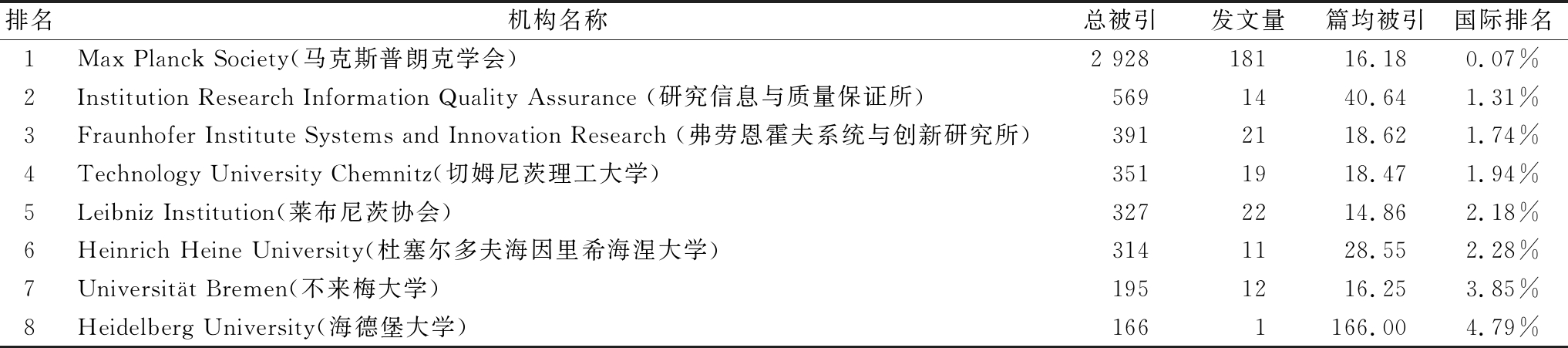 表3 第二阶段在科学计量学领域发表文献的部分德国机构(2008—2018年)(Top5%)