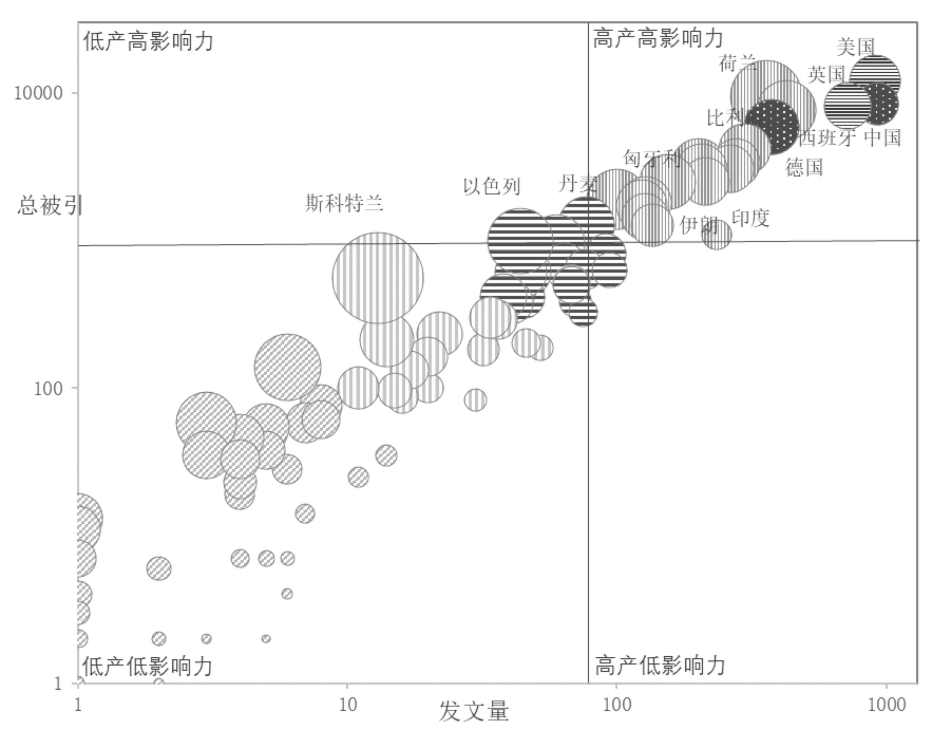 为了直观显示变化情况,以战略坐标图为例进行比较。图中横轴表示各国科学计量学领域发文量(以1为起点),纵轴表示总被引频次(以1为起点),气泡面积表示篇均被引频次。横竖实线分别表示平均总被引频次和国际平均发文量,以此将战略坐标图划分为4个方阵:高产高影响力、低产低影响力、高产低影响力、低产高影响力。图3中所有气泡以总被引频次和离国际均值的距离作为依据划分为六大区域。