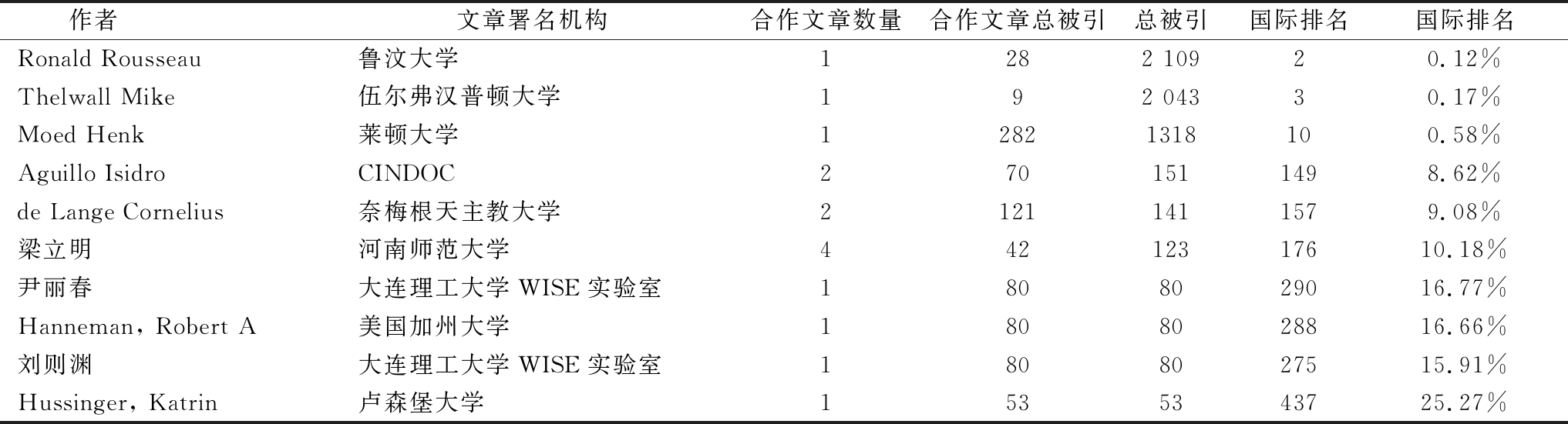 作者 文章署名机构合作文章数量合作文章总被引总被引国际排名国际排名Ronald Rousseau鲁汶大学1282 10920.12%Thelwall Mike伍尔弗汉普顿大学192 04330.17%Moed Henk莱顿大学12821318100.58%Aguillo IsidroCINDOC2701511498.62%de Lange Cornelius奈梅根天主教大学21211411579.08%梁立明河南师范大学44212317610.18%尹丽春大连理工大学WISE实验室1808029016.77%Hanneman, Robert A美国加州大学1808028816.66%刘则渊大连理工大学WISE实验室1808027515.91%Hussinger, Katrin卢森堡大学1535343725.27%
