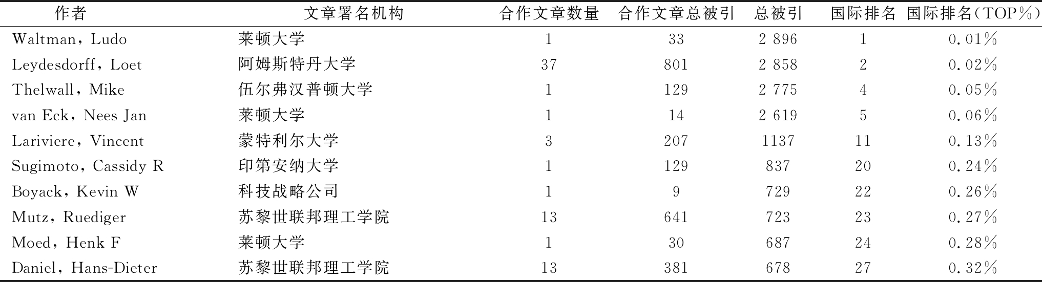 作者 文章署名机构合作文章数量合作文章总被引总被引国际排名国际排名(TOP%)Waltman, Ludo莱顿大学1332 89610.01%Leydesdorff, Loet阿姆斯特丹大学378012 85820.02%Thelwall, Mike伍尔弗汉普顿大学11292 77540.05%van Eck, Nees Jan莱顿大学1142 61950.06%Lariviere, Vincent蒙特利尔大学32071137110.13%Sugimoto, Cassidy R印第安纳大学1129837200.24%Boyack, Kevin W科技战略公司19729220.26%Mutz, Ruediger苏黎世联邦理工学院13641723230.27%Moed, Henk F莱顿大学130687240.28%Daniel, Hans-Dieter苏黎世联邦理工学院13381678270.32%