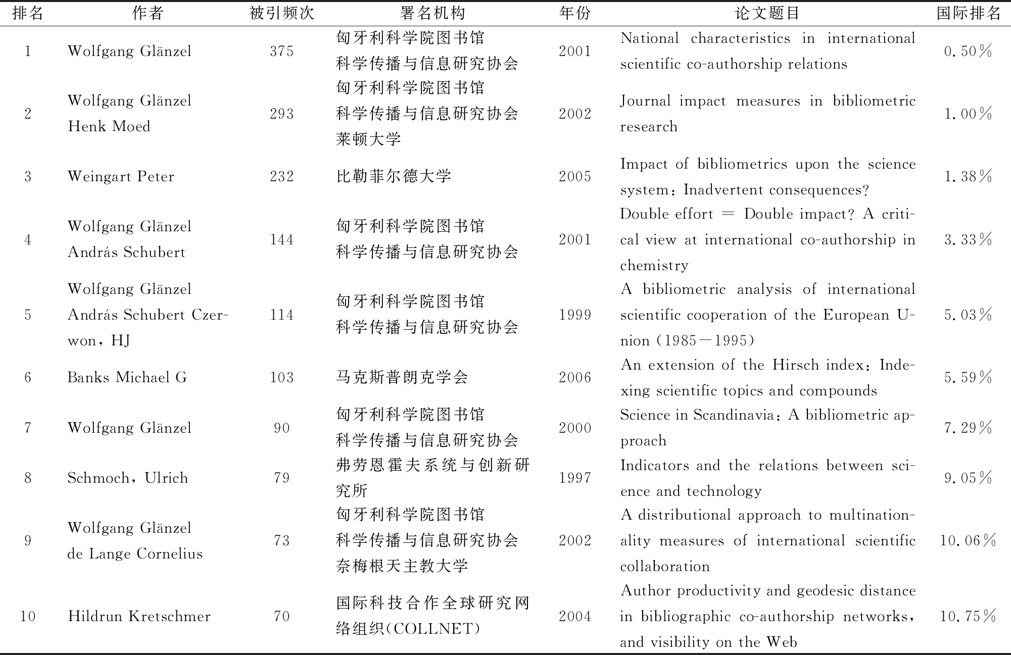排名作者被引频次署名机构年份论文题目国际排名1Wolfgang Glänzel375匈牙利科学院图书馆科学传播与信息研究协会2001National characteristics in international scientific co-authorship relations0.50%2Wolfgang Glänzel Henk Moed293匈牙利科学院图书馆科学传播与信息研究协会莱顿大学2002Journal impact measures in bibliometric research1.00%3Weingart Peter 232比勒菲尔德大学2005Impact of bibliometrics upon the science system: Inadvertent consequences?1.38%4Wolfgang GlänzelAndrs Schubert144匈牙利科学院图书馆科学传播与信息研究协会2001Double effort = Double impact? A criti-cal view at international co-authorship in chemistry3.33%5Wolfgang GlänzelAndrs Schubert Czer-won, HJ114匈牙利科学院图书馆 科学传播与信息研究协会1999A bibliometric analysis of international scientific cooperation of the European U-nion (1985-1995)5.03%6Banks Michael G103马克斯普朗克学会2006An extension of the Hirsch index: Inde-xing scientific topics and compounds5.59%7Wolfgang Glänzel90匈牙利科学院图书馆科学传播与信息研究协会2000Science in Scandinavia: A bibliometric ap-proach7.29%8Schmoch, Ulrich79弗劳恩霍夫系统与创新研究所1997Indicators and the relations between sci-ence and technology9.05%9Wolfgang Glänzel de Lange Cornelius73匈牙利科学院图书馆 科学传播与信息研究协会奈梅根天主教大学2002A distributional approach to multination-ality measures of international scientific collaboration10.06%10Hildrun Kretschmer70国际科技合作全球研究网络组织(COLLNET)2004Author productivity and geodesic distance in bibliographic co-authorship networks, and visibility on the Web10.75%