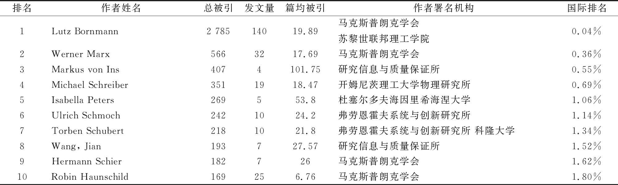 排名作者姓名总被引发文量篇均被引作者署名机构国际排名1Lutz Bornmann2 78514019.89马克斯普朗克学会 苏黎世联邦理工学院0.04%2Werner Marx5663217.69马克斯普朗克学会0.36%3Markus von Ins4074101.75研究信息与质量保证所0.55%4Michael Schreiber3511918.47开姆尼茨理工大学物理研究所0.69%5Isabella Peters269553.8杜塞尔多夫海因里希海涅大学1.06%6Ulrich Schmoch2421024.2弗劳恩霍夫系统与创新研究所1.14%7Torben Schubert2181021.8弗劳恩霍夫系统与创新研究所 科隆大学1.34%8Wang, Jian193727.57研究信息与质量保证所1.52%9Hermann Schier182726马克斯普朗克学会1.62%10Robin Haunschild 169256.76马克斯普朗克学会1.80%
