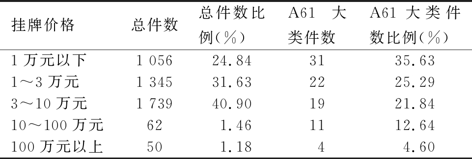 挂牌价格总件数总件数比例(%)A61大类件数A61大类件数比例(%) 1万元以下1 05624.843135.63 1~3万元1 34531.632225.29 3~10万元1 73940.901921.84 10~100万元621.461112.64 100万元以上501.1844.60
