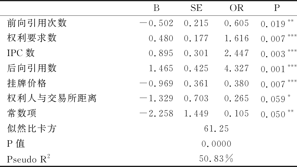 对于因变量A进行回归分析,使用向前筛选策略逐步将自变量引入回归方程直至再无具有统计学意义的自变量可被引入,最终进入回归方程的自变量为6个:前向引用数、权利要求数、IPC数、后向引用数、挂牌价格、权利人与交易所距离,回归结果见表9。其中,权利要求数、IPC数、后向引用数、挂牌价格的显著性水平为1%,前向引用数为5%,权利人与交易所距离为10%。模型似然比卡方统计量为61.25,对应的P值为0.00,故整个方程所有系数的联合显著性很高。