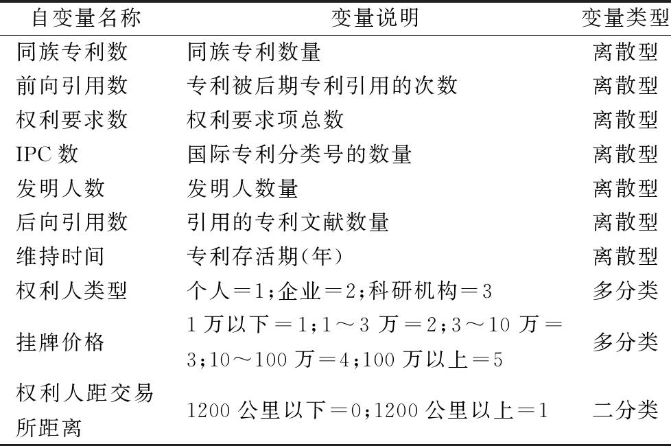 自变量名称变量说明变量类型同族专利数同族专利数量离散型前向引用数专利被后期专利引用的次数离散型权利要求数权利要求项总数离散型IPC数国际专利分类号的数量离散型发明人数发明人数量离散型后向引用数引用的专利文献数量离散型维持时间专利存活期(年)离散型权利人类型个人=1;企业=2;科研机构=3多分类挂牌价格1万以下=1;1~3万=2;3~10万=3;10~100万=4;100万以上=5多分类权利人距交易所距离1200公里以下=0;1200公里以上=1二分类