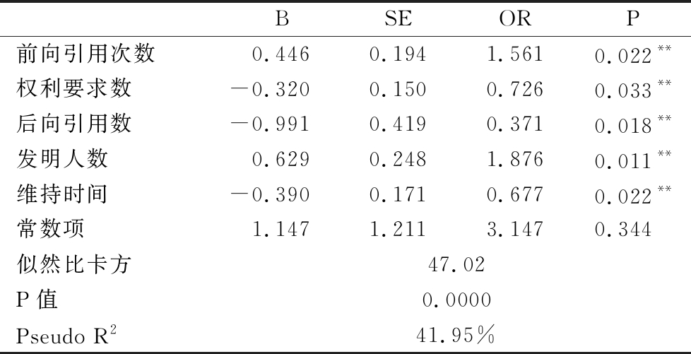 类似地,对因变量B进行回归分析,最终进入回归方程的自变量为5个:前向引用数、权利要求数、后向引用数、发明人数、维持时间,显著性水平为5%,回归结果见表10。模型似然比卡方统计量为47.02,对应的P值为0.00,整个方程所有系数的联合显著性也很高。