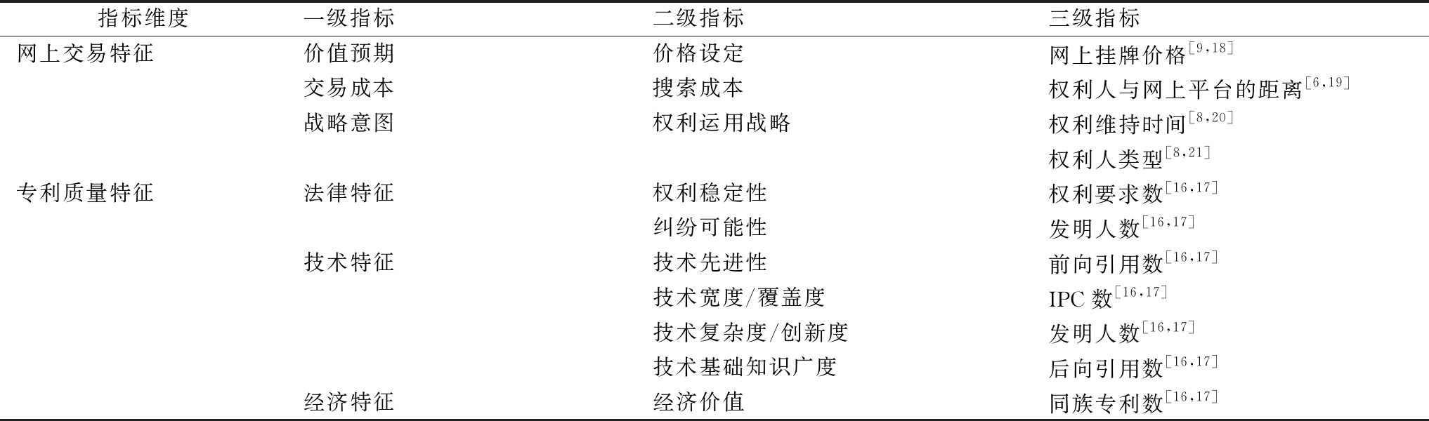 指标维度一级指标二级指标 三级指标网上交易特征价值预期价格设定网上挂牌价格[9,18] 交易成本搜索成本权利人与网上平台的距离[6,19] 战略意图权利运用战略权利维持时间[8,20]权利人类型[8,21]专利质量特征法律特征权利稳定性权利要求数[16,17] 纠纷可能性发明人数[16,17] 技术特征技术先进性前向引用数[16,17] 技术宽度/覆盖度IPC数[16,17] 技术复杂度/创新度发明人数[16,17] 技术基础知识广度后向引用数[16,17] 经济特征经济价值同族专利数[16,17]