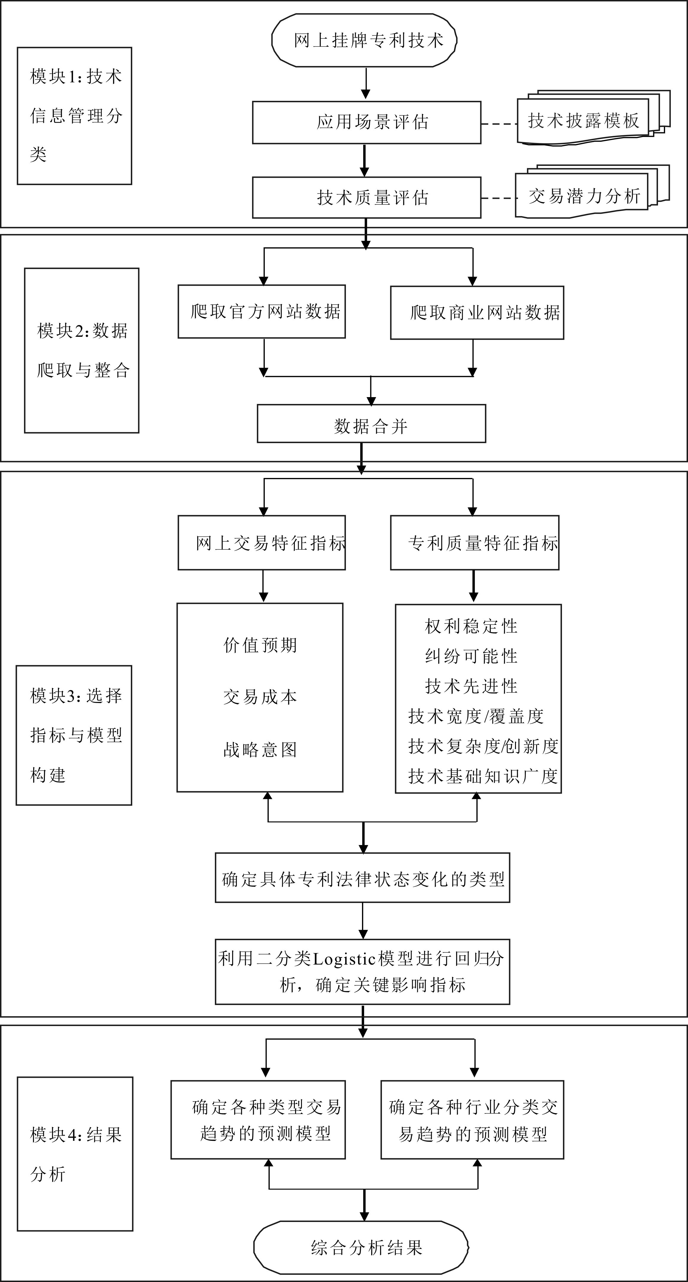 由图2所示,该流程主要包括4个功能模块:①挂牌专利信息管理分类,平台运营方区分应用场景评估和技术质量评估两种专利筛选模式,并进入不同的评估程序;②数据爬取与整合,从官方专利数据库和商业网站数据库中爬取专利信息并对数据进行整合处理;③选取指标与构建核心模型,链接网上交易特征和专利质量特征两个维度的分析指标,根据网上平台技术资源和用户兴趣方向,以不同类型的专利法律状态变化作为预测对象,利用二分类Logistics回归模型分析得出若干关键影响指标;④交易趋势结果分析,在细分IPC行业类别内,分析得到相应专利法律状态可能出现的概率,最终将分析结果以图像、清单、辅助说明等方式呈现,并形成综合分析报告。