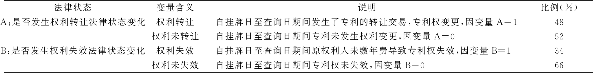 法律状态变量含义说明比例(%)A:是否发生权利转让法律状态变化权利转让自挂牌日至查询日期间发生了专利的转让交易,专利权变更,因变量A=148权利未转让自挂牌日至查询日期间专利未发生权利变更,因变量A=052B:是否发生权利失效法律状态变化权利失效自挂牌日至查询日期间原权利人未缴年费导致专利权失效,因变量B=134权利未失效自挂牌日至查询日期间专利权未失效,因变量B=066