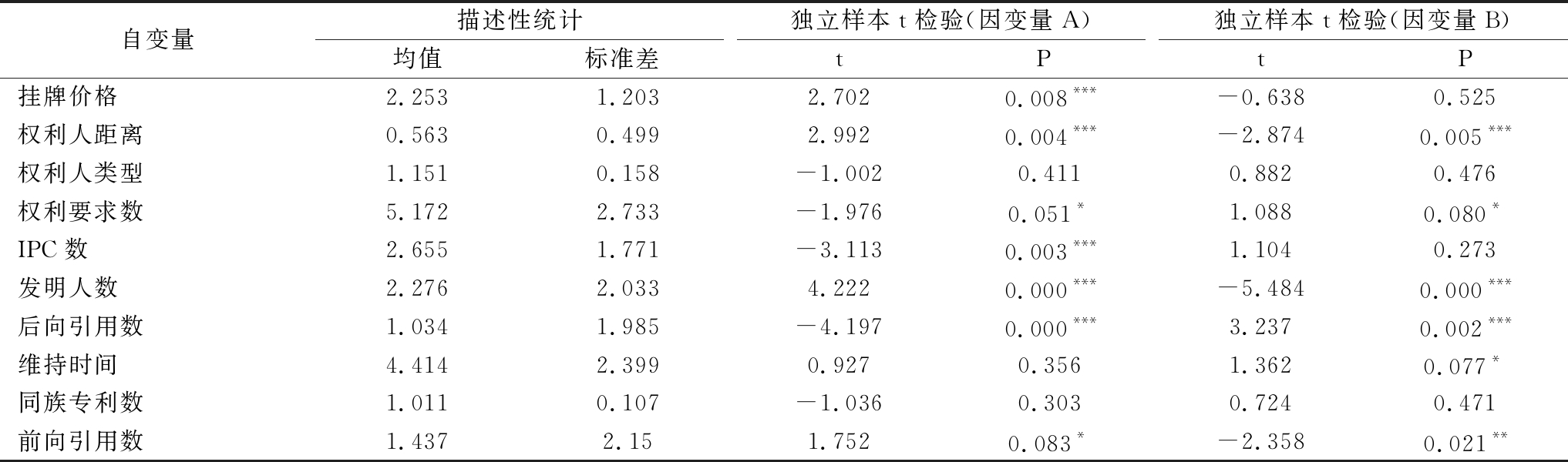 自变量描述性统计均值标准差独立样本t检验(因变量A)tP独立样本t检验(因变量B)tP挂牌价格2.2531.2032.7020.008***-0.6380.525权利人距离0.5630.4992.9920.004***-2.8740.005***权利人类型1.1510.158-1.0020.4110.8820.476权利要求数5.1722.733-1.9760.051*1.0880.080*IPC数2.6551.771-3.1130.003***1.1040.273发明人数2.2762.0334.2220.000***-5.4840.000***后向引用数1.0341.985-4.1970.000***3.2370.002***维持时间4.4142.3990.9270.3561.3620.077*同族专利数1.0110.107-1.0360.3030.7240.471前向引用数1.4372.151.7520.083*-2.3580.021**