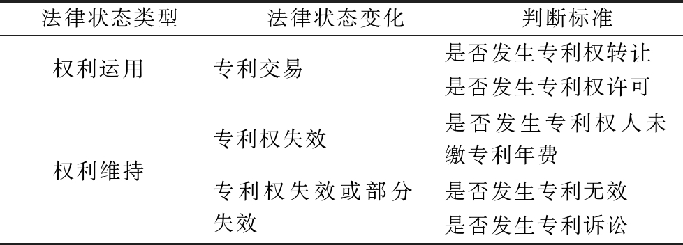 法律状态类型法律状态变化判断标准权利运用专利交易是否发生专利权转让是否发生专利权许可权利维持专利权失效是否发生专利权人未缴专利年费专利权失效或部分失效是否发生专利无效是否发生专利诉讼