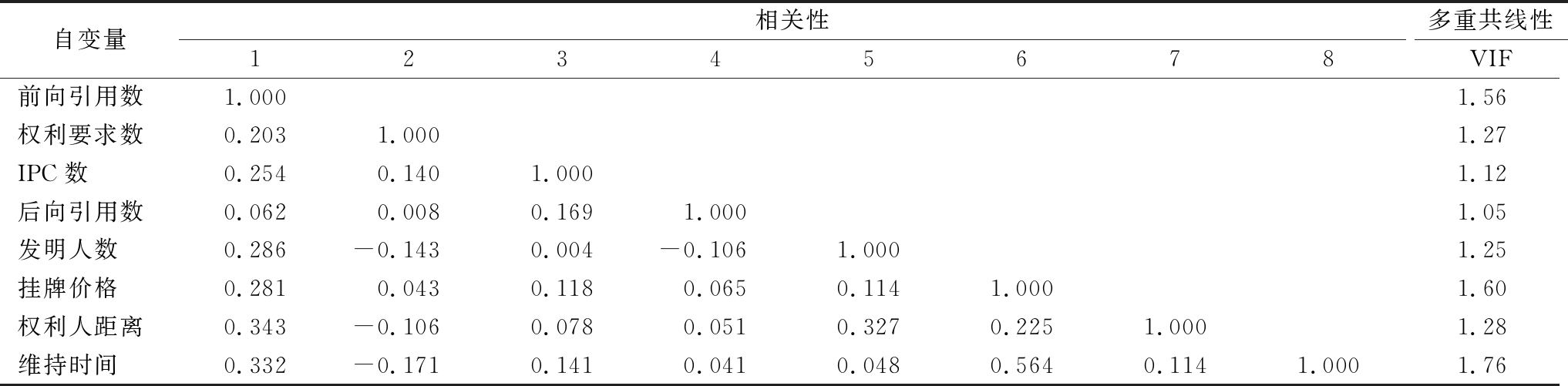 自变量相关性1 2 3 4 5 6 7 8多重共线性VIF前向引用数1.000 1.56权利要求数0.2031.000 1.27IPC数0.2540.1401.000 1.12后向引用数0.0620.0080.1691.000 1.05发明人数0.286-0.1430.004-0.1061.000 1.25挂牌价格0.2810.0430.1180.0650.1141.000 1.60权利人距离0.343-0.1060.0780.0510.3270.2251.000 1.28维持时间0.332-0.1710.1410.0410.0480.5640.1141.000 1.76