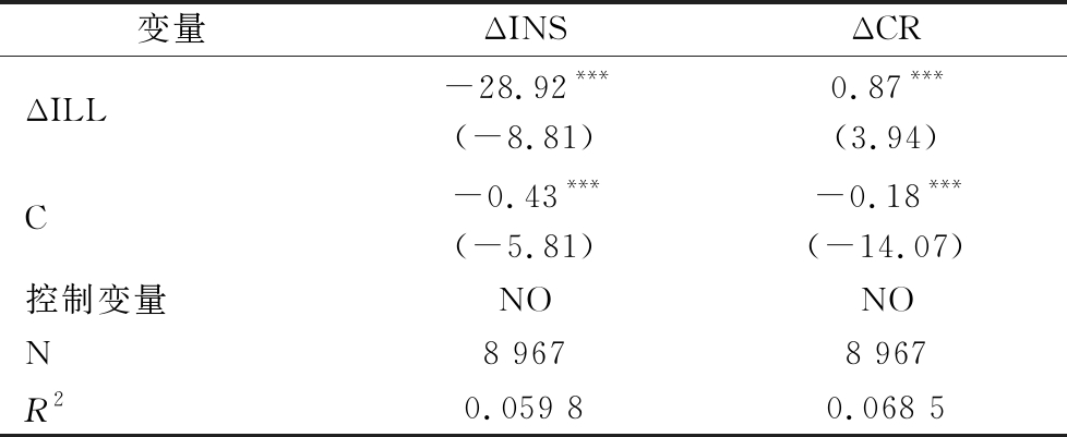 变量ΔINSΔCRΔILL-28.92***(-8.81)0.87***(3.94)C-0.43***(-5.81)-0.18***(-14.07)控制变量NONON8 9678 967R20.059 80.068 5