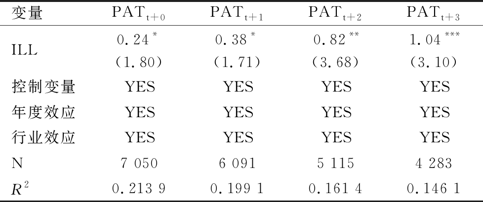 变量PATt+0PATt+1PATt+2PATt+3ILL0.24*(1.80)0.38*(1.71)0.82**(3.68)1.04***(3.10)控制变量YESYESYESYES年度效应YESYESYESYES行业效应YESYESYESYESN7 0506 0915 1154 283R20.213 90.199 10.161 40.146 1