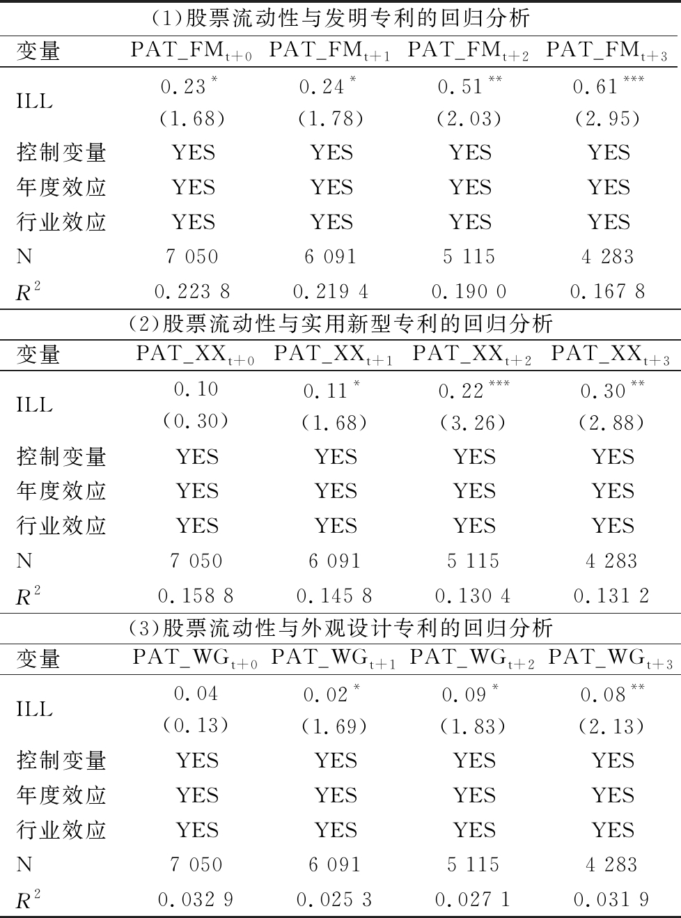 (1)股票流动性与发明专利的回归分析变量PAT_FMt+0PAT_FMt+1PAT_FMt+2PAT_FMt+3ILL0.23*(1.68)0.24*(1.78)0.51**(2.03)0.61***(2.95)控制变量YESYESYESYES年度效应YESYESYESYES行业效应YESYESYESYESN7 0506 0915 1154 283R20.223 80.219 40.190 00.167 8(2)股票流动性与实用新型专利的回归分析变量PAT_XXt+0PAT_XXt+1PAT_XXt+2PAT_XXt+3ILL0.10 (0.30)0.11*(1.68)0.22***(3.26)0.30**(2.88)控制变量YESYESYESYES年度效应YESYESYESYES行业效应YESYESYESYESN7 0506 0915 1154 283R20.158 80.145 80.130 40.131 2(3)股票流动性与外观设计专利的回归分析变量PAT_WGt+0PAT_WGt+1PAT_WGt+2PAT_WGt+3ILL0.04(0.13)0.02*(1.69)0.09*(1.83)0.08**(2.13)控制变量YESYESYESYES年度效应YESYESYESYES行业效应YESYESYESYESN7 0506 0915 1154 283R20.032 90.025 30.027 10.031 9