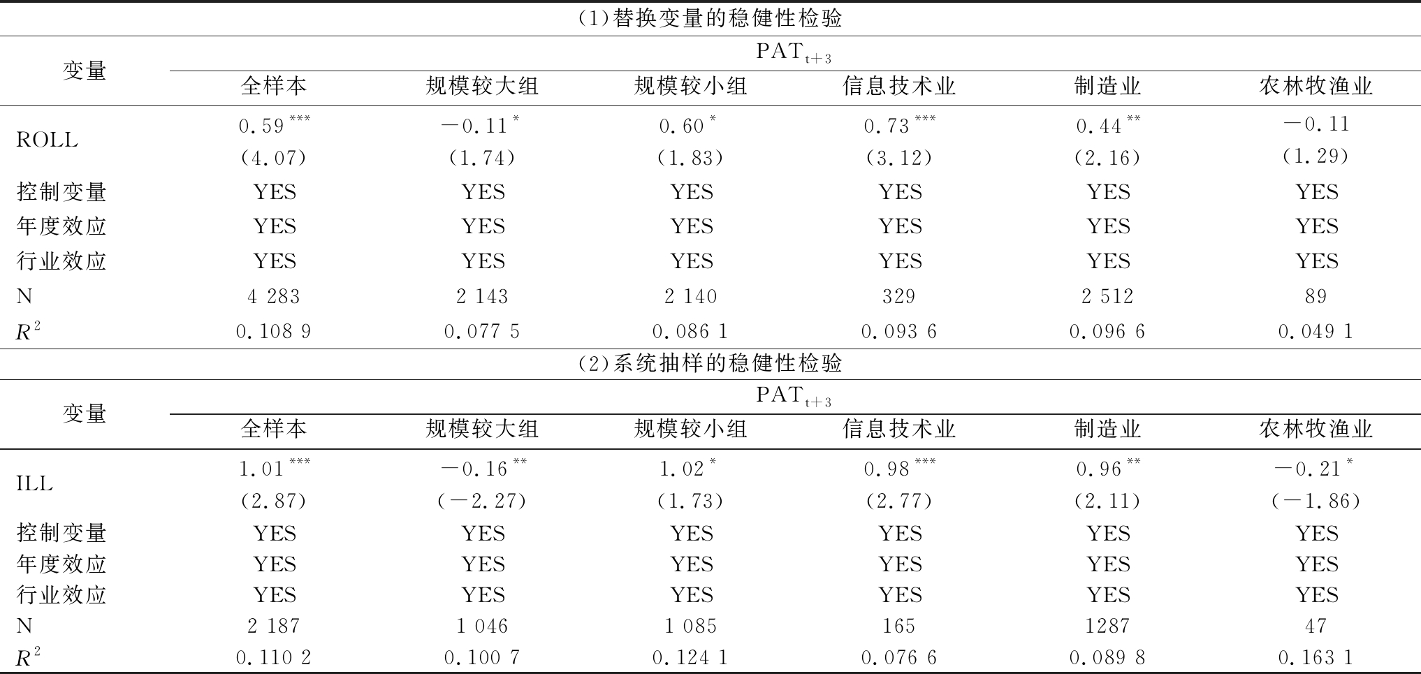 (1)替换变量的稳健性检验变量PATt+3全样本规模较大组规模较小组信息技术业制造业农林牧渔业ROLL0.59***(4.07)-0.11*(1.74)0.60*(1.83)0.73***(3.12)0.44**(2.16)-0.11(1.29)控制变量YESYESYESYESYESYES年度效应YESYESYESYESYESYES行业效应YESYESYESYESYESYESN4 2832 1432 1403292 51289R20.108 90.077 50.086 10.093 60.096 60.049 1(2)系统抽样的稳健性检验变量PATt+3全样本规模较大组规模较小组信息技术业制造业农林牧渔业ILL1.01***(2.87)-0.16**(-2.27)1.02*(1.73)0.98***(2.77)0.96**(2.11)-0.21*(-1.86)控制变量YESYESYESYESYESYES年度效应YESYESYESYESYESYES行业效应YESYESYESYESYESYESN2 1871 0461 085165 128747R20.110 20.100 70.124 10.076 60.089 80.163 1