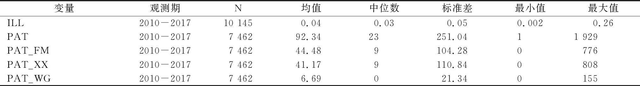 变量观测期N均值中位数标准差最小值最大值ILL2010-201710 1450.040.030.050.0020.26PAT2010-20177 46292.3423251.0411 929PAT_FM2010-20177 46244.489104.280776PAT_XX2010-20177 46241.179110.840808PAT_WG2010-20177 4626.69021.340155