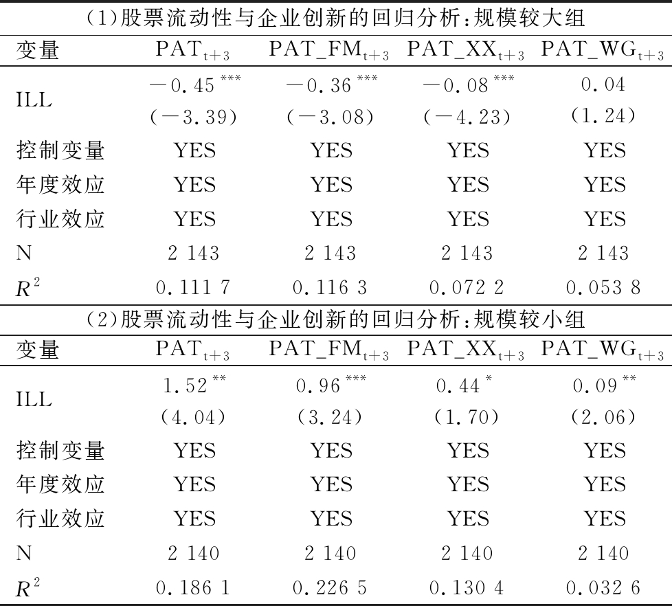 表4 股票流动性与企业创新回归分析结果:基于企业规模比较