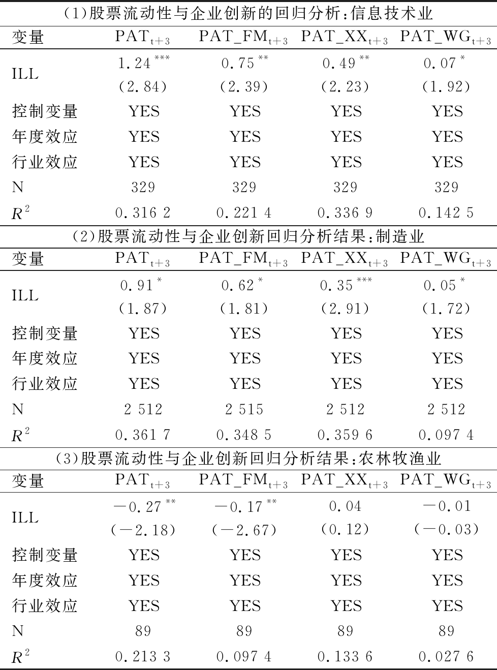 (1)股票流动性与企业创新的回归分析:信息技术业变量PATt+3PAT_FMt+3PAT_XXt+3PAT_WGt+3ILL1.24***(2.84)0.75**(2.39)0.49**(2.23)0.07*(1.92)控制变量YESYESYESYES年度效应YESYESYESYES行业效应YESYESYESYESN329329329329R20.316 20.221 40.336 90.142 5(2)股票流动性与企业创新回归分析结果:制造业变量PATt+3PAT_FMt+3PAT_XXt+3PAT_WGt+3ILL0.91*(1.87)0.62*(1.81)0.35***(2.91)0.05*(1.72)控制变量YESYESYESYES年度效应YESYESYESYES行业效应YESYESYESYESN2 5122 5152 5122 512R20.361 70.348 50.359 60.097 4(3)股票流动性与企业创新回归分析结果:农林牧渔业变量PATt+3PAT_FMt+3PAT_XXt+3PAT_WGt+3ILL-0.27**(-2.18)-0.17**(-2.67)0.04(0.12)-0.01(-0.03)控制变量YESYESYESYES年度效应YESYESYESYES行业效应YESYESYESYESN89898989R20.213 30.097 40.133 60.027 6