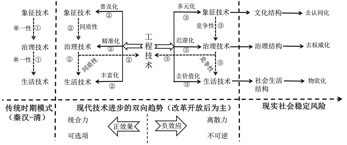 但技术进步还有另一面,即副作用,如图1中的路径③。工程技术对象征技术的直接副作用是导致其多元化,全球飞行与航行技术、全球即时通讯技术等极大促进了思想和文化交流。我国传统文化、党的执政理念都需要直接面对西方文化和理念的冲击,从而导致社会上各种思潮林立。工程技术对治理技术的副作用是使治理技术迟滞化,工程技术发展日新月异,而治理技术变革相对缓慢。另外,管理机构人员有限,无法应对庞大的市场和社会主体,如基因编辑婴儿事件、网约顺风车问题、问题疫苗事件等。工程技术对生活技术的副作用是使生活技术物去价值化。表面上,工程技术进步带来生活技术物可选择性的极大丰富,手机、电脑、汽车每年更新一代,但也意味着任何一项技术物的价值都被极大贬值,无法成为传统社会的“传家宝”。另外,工程技术还消解了个性,所有人都在使用功能雷同的手机、电脑,人们的生活、工作模式也极为雷同,传统手工艺不断消失,全国古镇越发同质化,各民族生活方式区别不断缩小,所有城市的大楼、住宅小区、公园设计、高铁站极度雷同。在路径③中,象征技术是竞争性的而非统一的,既导致无法用同质化的意识形态、社会信仰指导其它技术系统,也导致4个技术系统之间的关联失效,离心力增强,最致命的是这种离心力是不可逆的。