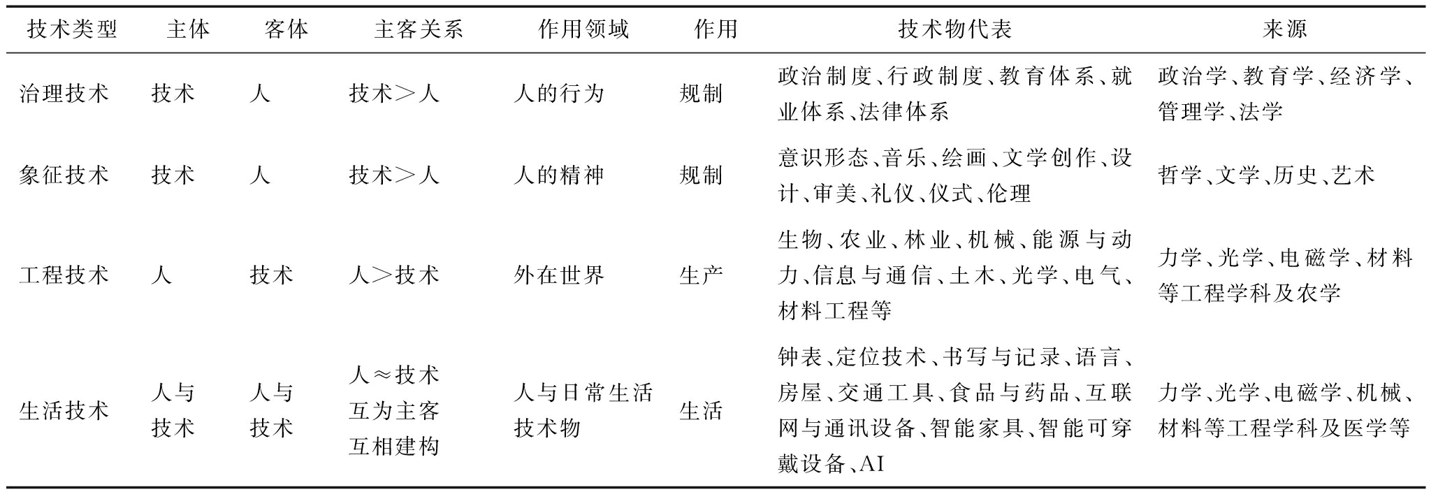 技术类型主体客体主客关系作用领域作用技术物代表来源治理技术技术人技术>人人的行为规制政治制度、行政制度、教育体系、就业体系、法律体系政治学、教育学、经济学、管理学、法学象征技术技术人技术>人人的精神规制意识形态、音乐、绘画、文学创作、设计、审美、礼仪、仪式、伦理哲学、文学、历史、艺术工程技术人技术人>技术外在世界生产生物、农业、林业、机械、能源与动力、信息与通信、土木、光学、电气、材料工程等力学、光学、电磁学、材料等工程学科及农学生活技术人与技术人与技术人≈技术互为主客互相建构人与日常生活技术物生活钟表、定位技术、书写与记录、语言、房屋、交通工具、食品与药品、互联网与通讯设备、智能家具、智能可穿戴设备、AI力学、光学、电磁学、机械、材料等工程学科及医学等