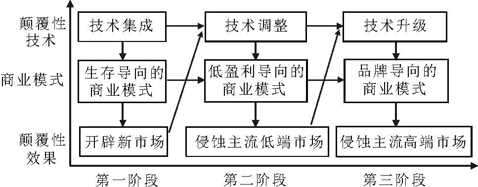 (1)颠覆性技术与商业模式的独立演进过程。颠覆性技术在演进过程中逐级提升,经历了技术集成、技术调整以及技术升级3个阶段,其技术在主流性能维度上不断改进,自下而上地满足主流市场需求。同时,建立新的技术轨道,在非主流性能维度上进行改进,使得竞争基础从主流性能转向非主流性能。由于各阶段情境和战略目标不同,商业模式导向也随之发生变化,经历了生存导向、低盈利导向和品牌导向3个阶段。在开辟新市场阶段,商业模式的重心在于提出新价值主张,通过挖掘潜在市场需求,获得生存空间,驱动颠覆性技术商业化;在侵蚀主流低端阶段,商业模式的重心在于价值创造和价值获取,通过准确定位成本和收入模式,以低盈利方式吸引主流低端消费者,并在大量跟随者中突围出来。在侵蚀主流高端市场阶段,商业模式的重心在于价值传递,为产品建立品牌形象,强大的品牌效应是提高颠覆性技术竞争力的重要手段,有助于进一步抢占主流产品的市场份额。