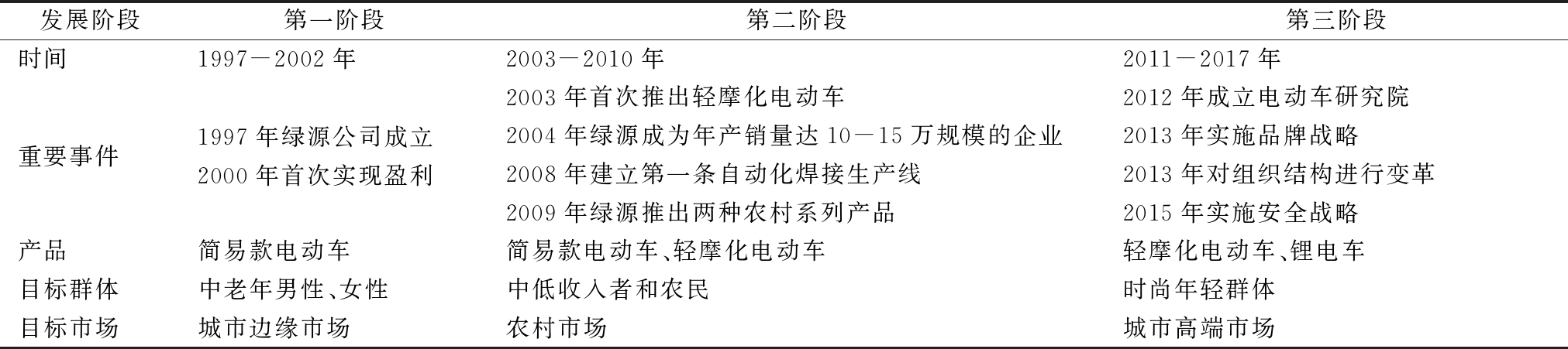 主要通过历史事件分析和编码分析。在纵向案例研究中,首先进行阶段划分[34]。由于颠覆性创新贯穿绿源整个发展过程,进行历史事件分析有助于获取并分析丰富的纵向数据,通过反复研究时间线和数据,结合重大事件,以结构化方式系统分析绿源企业发展历程和关键事件,可以深入了解产品和目标群体表现。根据目标市场调整,将其演化过程划分为3个阶段,划分依据如表1所示。