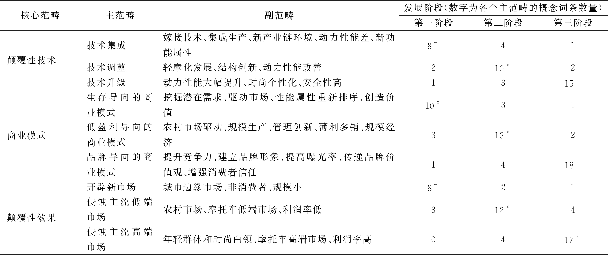 核心范畴主范畴副范畴发展阶段(数字为各个主范畴的概念词条数量)第一阶段第二阶段第三阶段颠覆性技术技术集成嫁接技术、集成生产、新产业链环境、动力性能差、新功能属性8*41技术调整轻摩化发展、结构创新、动力性能改善210*2技术升级动力性能大幅提升、时尚个性化、安全性高1315*商业模式生存导向的商业模式挖掘潜在需求、驱动市场、性能属性重新排序、创造价值10*31低盈利导向的商业模式农村市场驱动、规模生产、管理创新、薄利多销、规模经济313*2品牌导向的商业模式提升竞争力、建立品牌形象、提高曝光率、传递品牌价值观、增强消费者信任1418*颠覆性效果开辟新市场城市边缘市场、非消费者、规模小8*21侵蚀主流低端市场农村市场、摩托车低端市场、利润率低312*4侵蚀主流高端市场年轻群体和时尚白领、摩托车高端市场、利润率高0417*