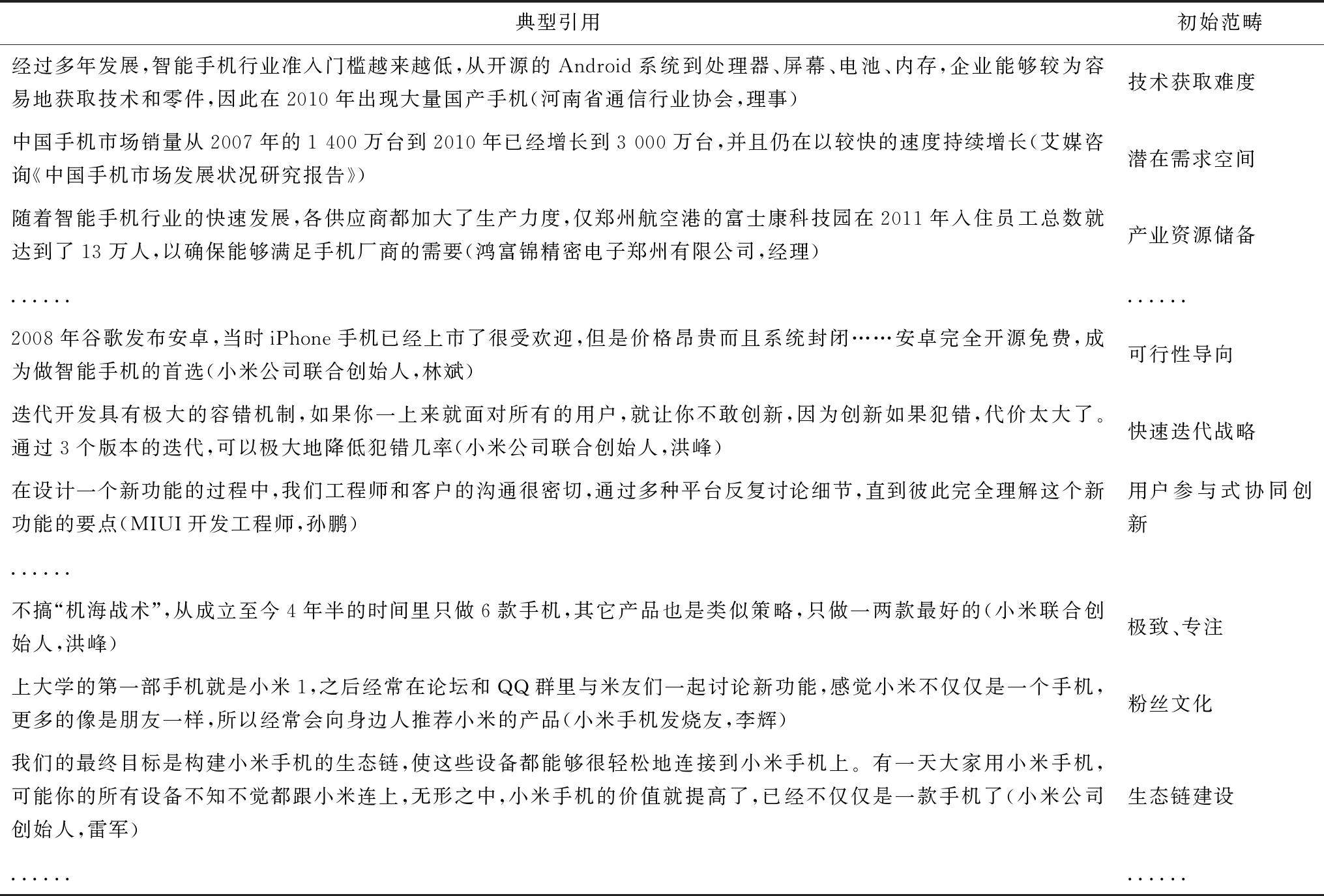 典型引用初始范畴经过多年发展,智能手机行业准入门槛越来越低,从开源的Android系统到处理器、屏幕、电池、内存,企业能够较为容易地获取技术和零件,因此在2010年出现大量国产手机(河南省通信行业协会,理事)技术获取难度中国手机市场销量从2007年的1 400万台到2010年已经增长到3 000万台,并且仍在以较快的速度持续增长(艾媒咨询《中国手机市场发展状况研究报告》)潜在需求空间随着智能手机行业的快速发展,各供应商都加大了生产力度,仅郑州航空港的富士康科技园在2011年入住员工总数就达到了13万人,以确保能够满足手机厂商的需要(鸿富锦精密电子郑州有限公司,经理)产业资源储备............2008年谷歌发布安卓,当时iPhone手机已经上市了很受欢迎,但是价格昂贵而且系统封闭……安卓完全开源免费,成为做智能手机的首选(小米公司联合创始人,林斌)可行性导向迭代开发具有极大的容错机制,如果你一上来就面对所有的用户,就让你不敢创新,因为创新如果犯错,代价太大了。通过3个版本的迭代,可以极大地降低犯错几率(小米公司联合创始人,洪峰)快速迭代战略在设计一个新功能的过程中,我们工程师和客户的沟通很密切,通过多种平台反复讨论细节,直到彼此完全理解这个新功能的要点(MIUI开发工程师,孙鹏)用户参与式协同创新......不搞“机海战术”,从成立至今4年半的时间里只做6款手机,其它产品也是类似策略,只做一两款最好的(小米联合创始人,洪峰)极致、专注上大学的第一部手机就是小米1,之后经常在论坛和QQ群里与米友们一起讨论新功能,感觉小米不仅仅是一个手机,更多的像是朋友一样,所以经常会向身边人推荐小米的产品(小米手机发烧友,李辉)粉丝文化我们的最终目标是构建小米手机的生态链,使这些设备都能够很轻松地连接到小米手机上。有一天大家用小米手机,可能你的所有设备不知不觉都跟小米连上,无形之中,小米手机的价值就提高了,已经不仅仅是一款手机了(小米公司创始人,雷军)生态链建设............