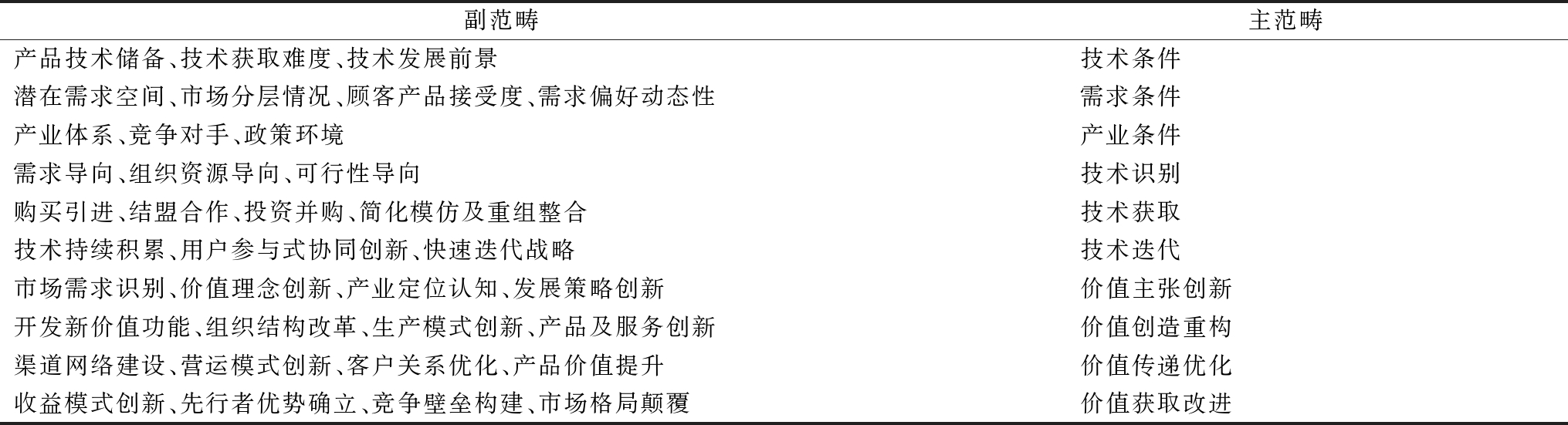 副范畴主范畴产品技术储备、技术获取难度、技术发展前景技术条件潜在需求空间、市场分层情况、顾客产品接受度、需求偏好动态性需求条件产业体系、竞争对手、政策环境产业条件需求导向、组织资源导向、可行性导向技术识别购买引进、结盟合作、投资并购、简化模仿及重组整合技术获取技术持续积累、用户参与式协同创新、快速迭代战略技术迭代市场需求识别、价值理念创新、产业定位认知、发展策略创新价值主张创新开发新价值功能、组织结构改革、生产模式创新、产品及服务创新价值创造重构渠道网络建设、营运模式创新、客户关系优化、产品价值提升价值传递优化收益模式创新、先行者优势确立、竞争壁垒构建、市场格局颠覆价值获取改进