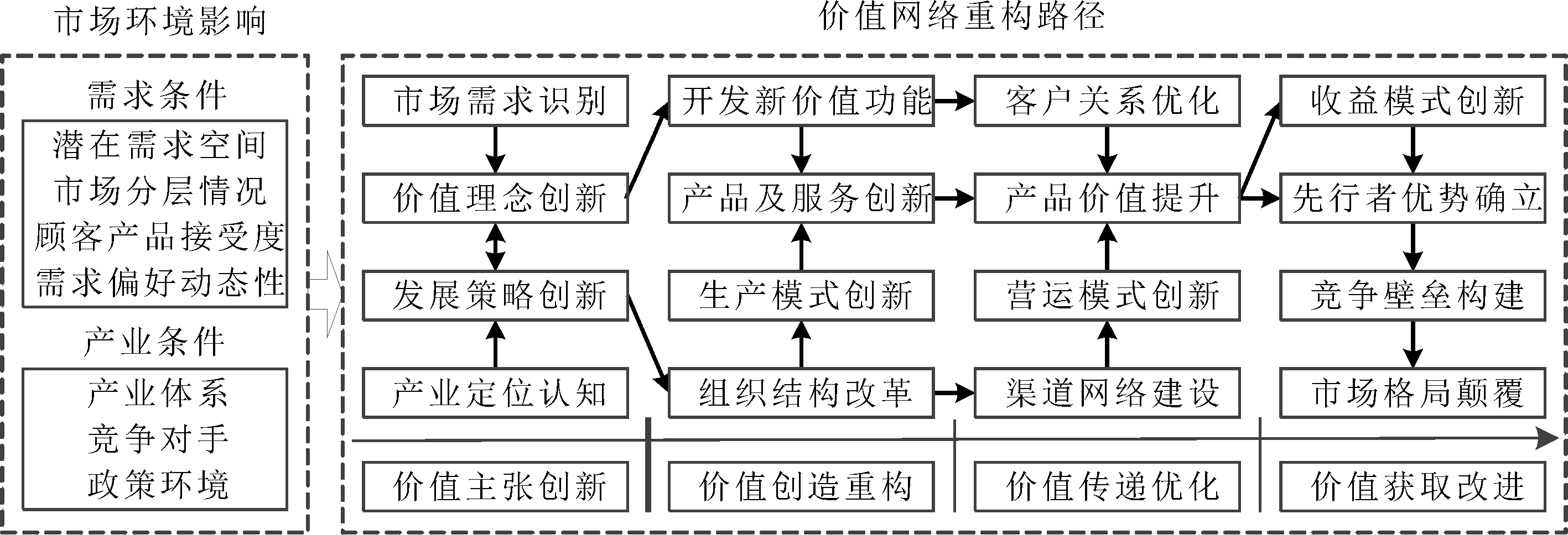 (2)颠覆式创新在市场环境影响下可以通过技术创新和价值网络重构实现。技术创新的目的是获取颠覆式产品所需技术,主要包括技术识别、技术获取和技术迭代3个阶段;价值网络重构的目的是基于产业体系创造具有颠覆式理念的产品以满足顾客需求,从而最终改变市场格局,主要包括价值主张创新、价值创造重构、价值传递优化和价值获取改进4个阶段。