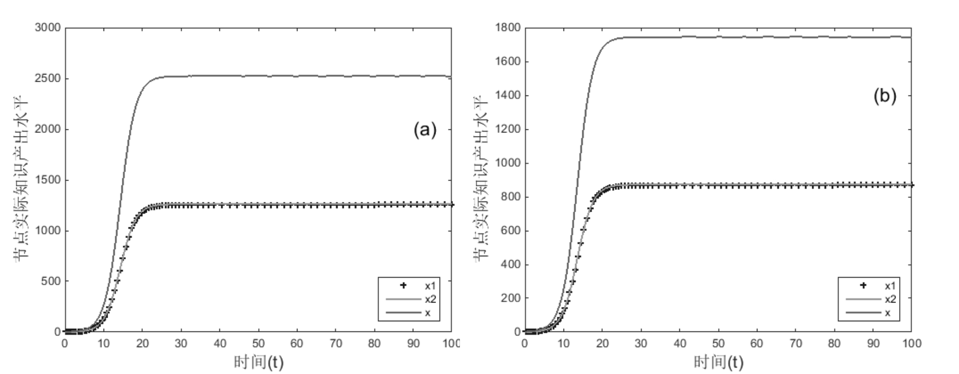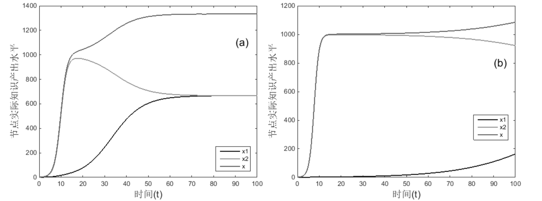 βij=βji=0,增长率ri变化,其它不变,运行结果如图13所示。对比图6(a)和图13,可得运行结果9:处于竞争关系的两节点自然增长率相差越大,越不利于竞争关系的稳定,增长率较大的节点平均知识产出水平较高,总的知识产出水平x与|r1-r2|呈反比。
