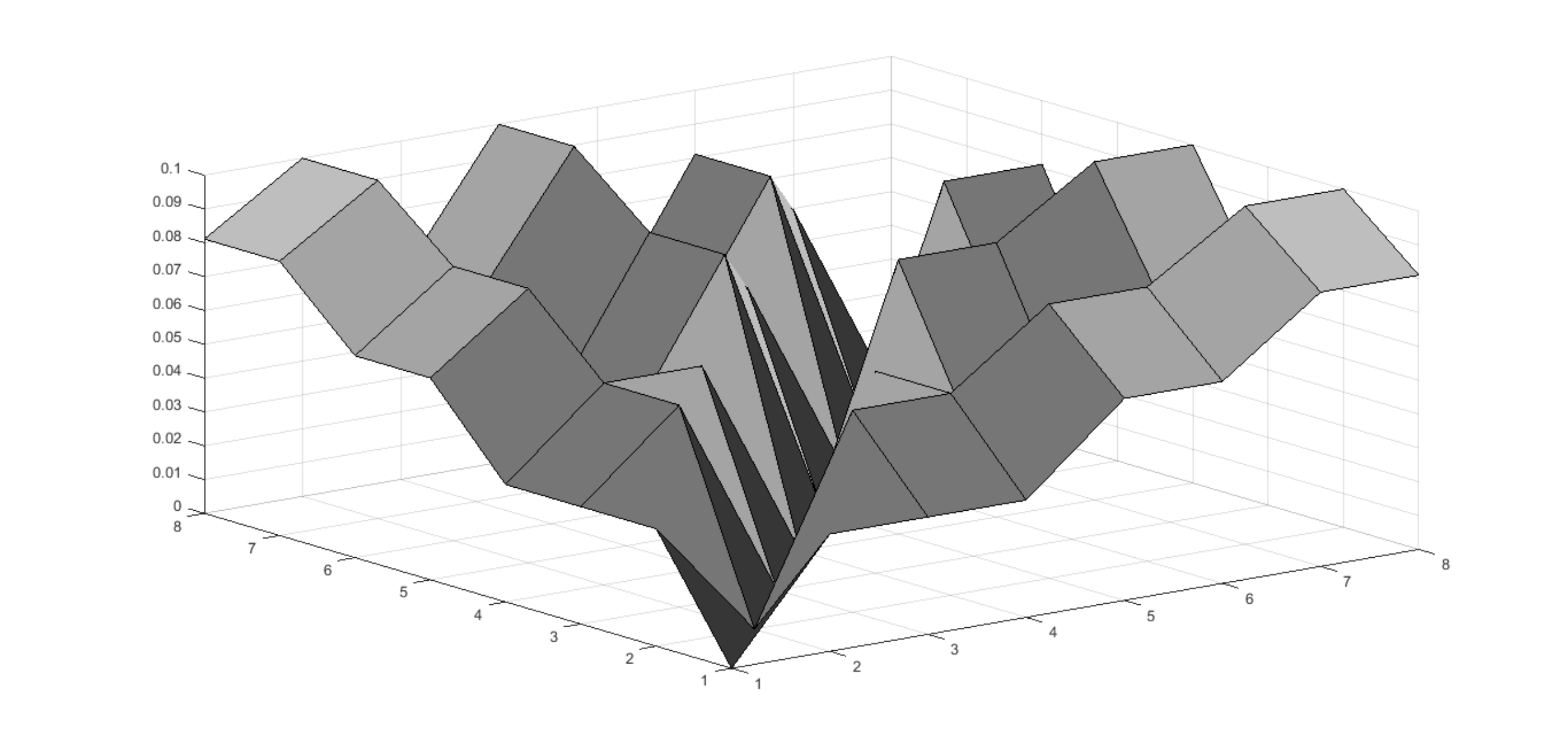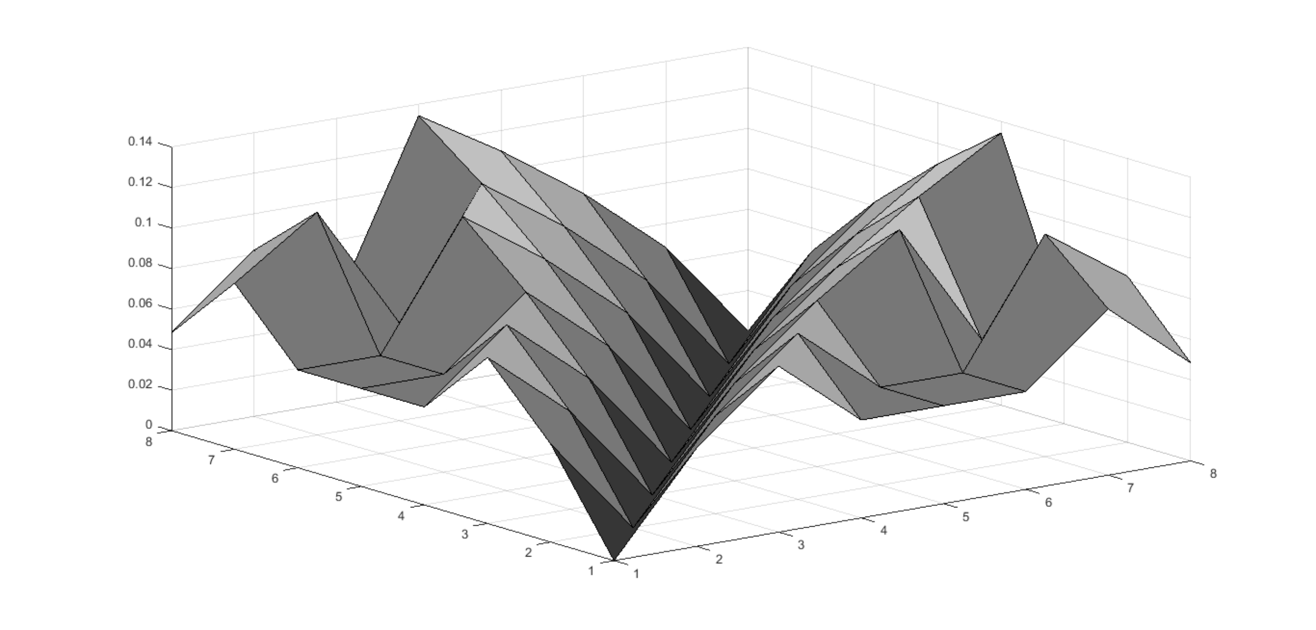 (3)试验运行及结果分析。①两种网络组织的知识熵与知识共享能力系数。使用MATLAB软件运行相关实验程序,得到两类网络组织中两两节点间知识熵,如图4和图5所示。观察两类组织的知识熵三维图发现:无中心点型网络组织节点间知识熵最大值大于单向型,且无中心点型节点间知识熵数值图像更为紧凑。说明在节点数目相同、直接相关节点联系长度为1的情况下,单向型网络组织节点间知识熵整体上小于无中心点型网络组织。进而,可以算出两个网络组织的知识共享能力系数分别为: