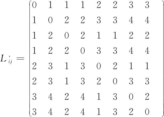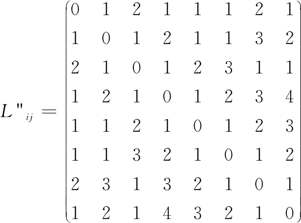 各网络组织任意两个节点i、j间联系长度记为Lij,由于联系长度是没有方向的,所以,节点i到j的联系长度与节点j到i的联系长度相等,即Lij=Lji。记3个网络组织的节点联系长度矩阵分别为![]()