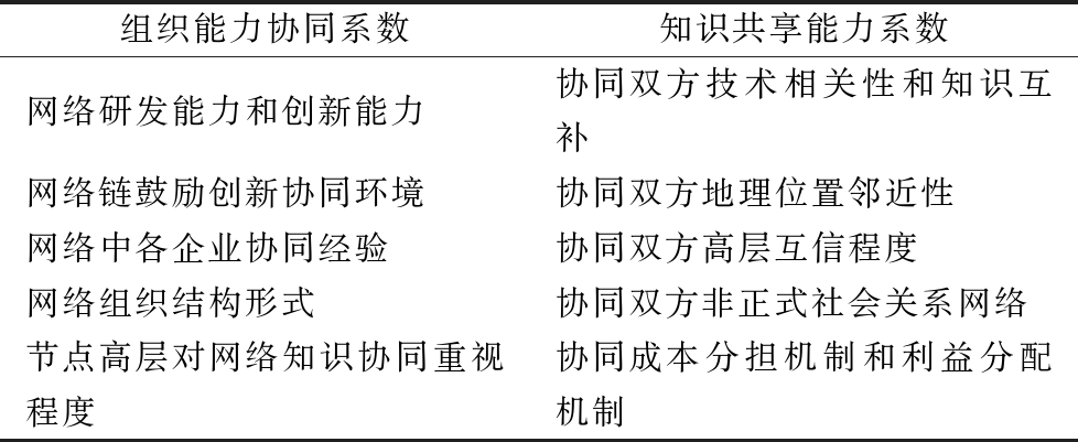 组织能力协同系数知识共享能力系数网络研发能力和创新能力协同双方技术相关性和知识互补网络链鼓励创新协同环境协同双方地理位置邻近性网络中各企业协同经验协同双方高层互信程度网络组织结构形式协同双方非正式社会关系网络节点高层对网络知识协同重视程度协同成本分担机制和利益分配机制