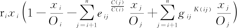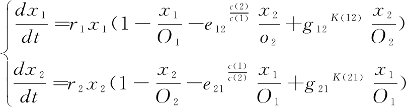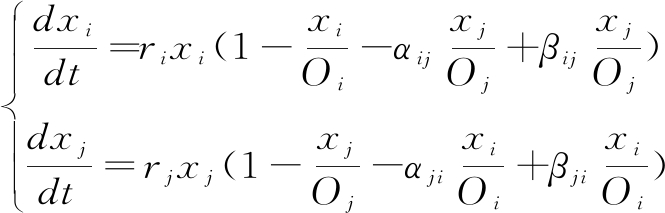 (2)两个节点协同竞合的Lotka-Volterra模型。两节点间共生关系类似于生物学中的种间竞争关系,因此,可采用一维Logistic模型增长方程的扩展模型,即Lotka-Volterra种间竞争模型,分析两个节点竞争合作过程中的知识创新产出增长情况[14]。考虑到节点间竞争合作的共生关系演化过程,以及信任机制和“贸易壁垒”的正负效应,构建两节点i、j的竞合基本模型。