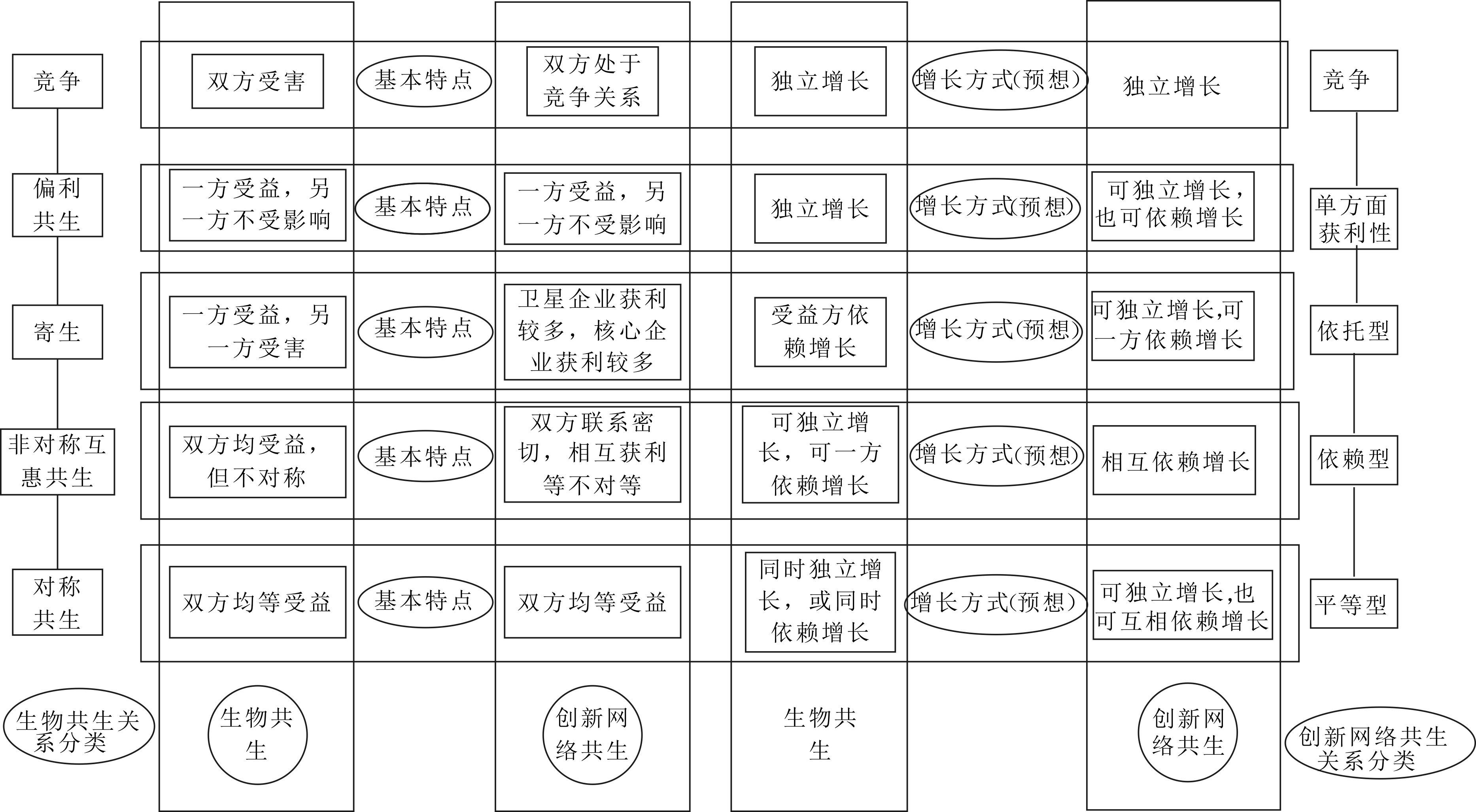 生态系统中生物间共生关系是客观存在的,一般来说不会随时间推移而发生变化,但在经济学领域,企业间商业合作或竞争战略会随着客观环境、企业发展方向以及领导者决策等因素而发生改变。因此,企业间共生关系将随着节点间战略合作或竞争调整等情况而发生变化。因此,由生物共生理论中的5种共生关系[11],推演出5种创新网络节点间共生关系(见图1),并根据5种共生关系的基本特点及不同关系下的生物增长方式,推演节点间共生关系的基本特点并预想不同共生关系下节点增长方式。由于依托型、单方获利型、依赖型3类共生关系区别并不大,且都具有偏利或者互惠特点,可统称为互惠关系。因此,将创新网络节点间共生关系分为竞争关系、互惠关系和平等关系3种。