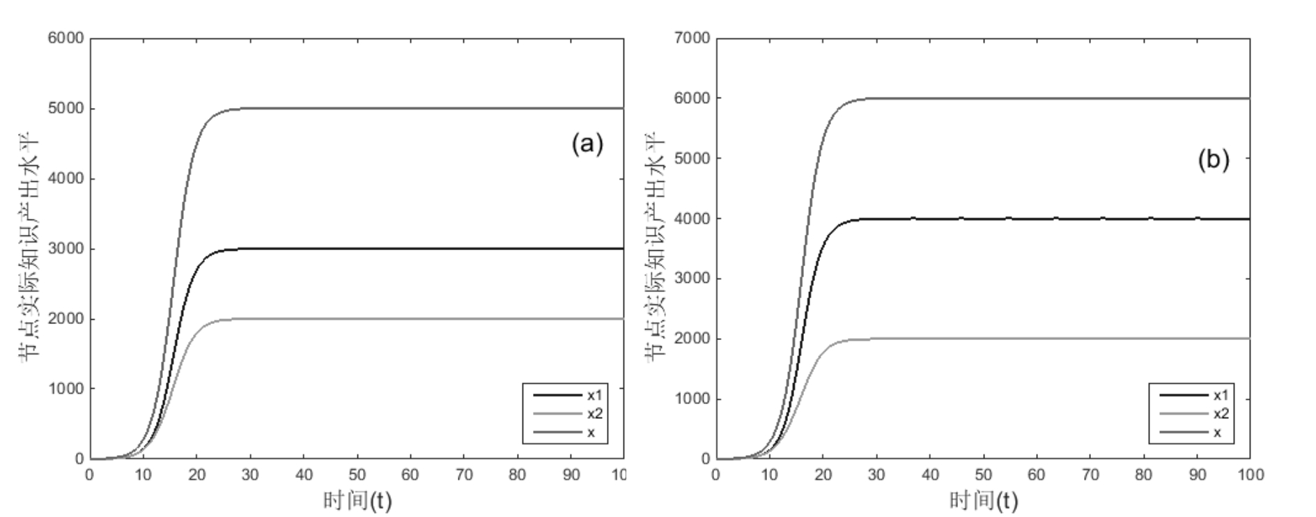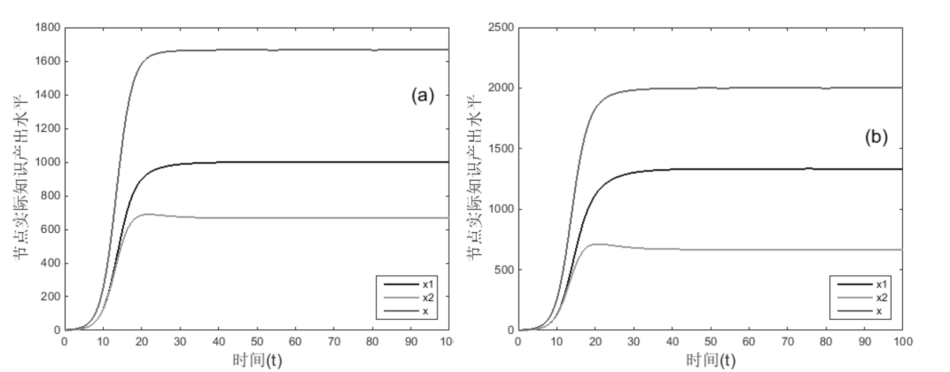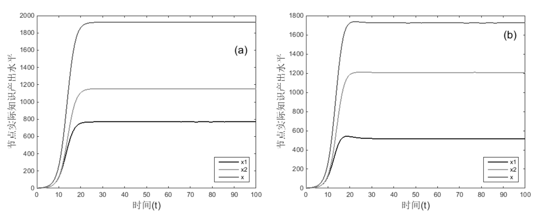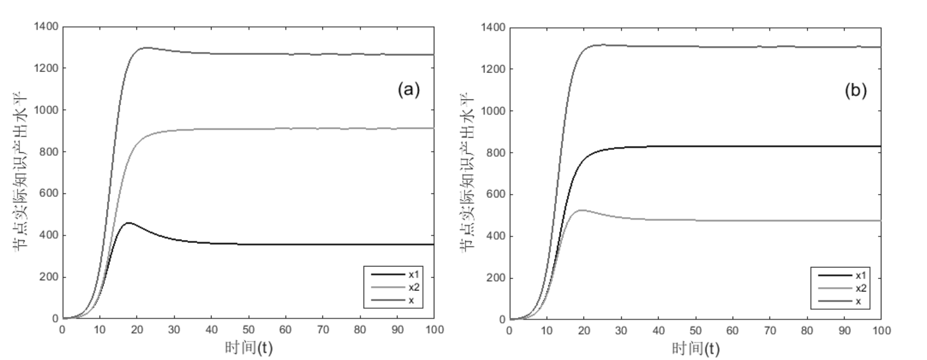αij=αji=0,增长率r变化,其它不变,运行结果如图14所示。对比图7(a)和图14,可得运行结果10:处于互惠关系节点的增长率差值|r1-r2|对共生关系达到平衡后的总实际知识产出水平无显著影响,对达到平衡的时间具有显著正向影响;节点增长率r对实际知识产出水平x具有显著正向影响。